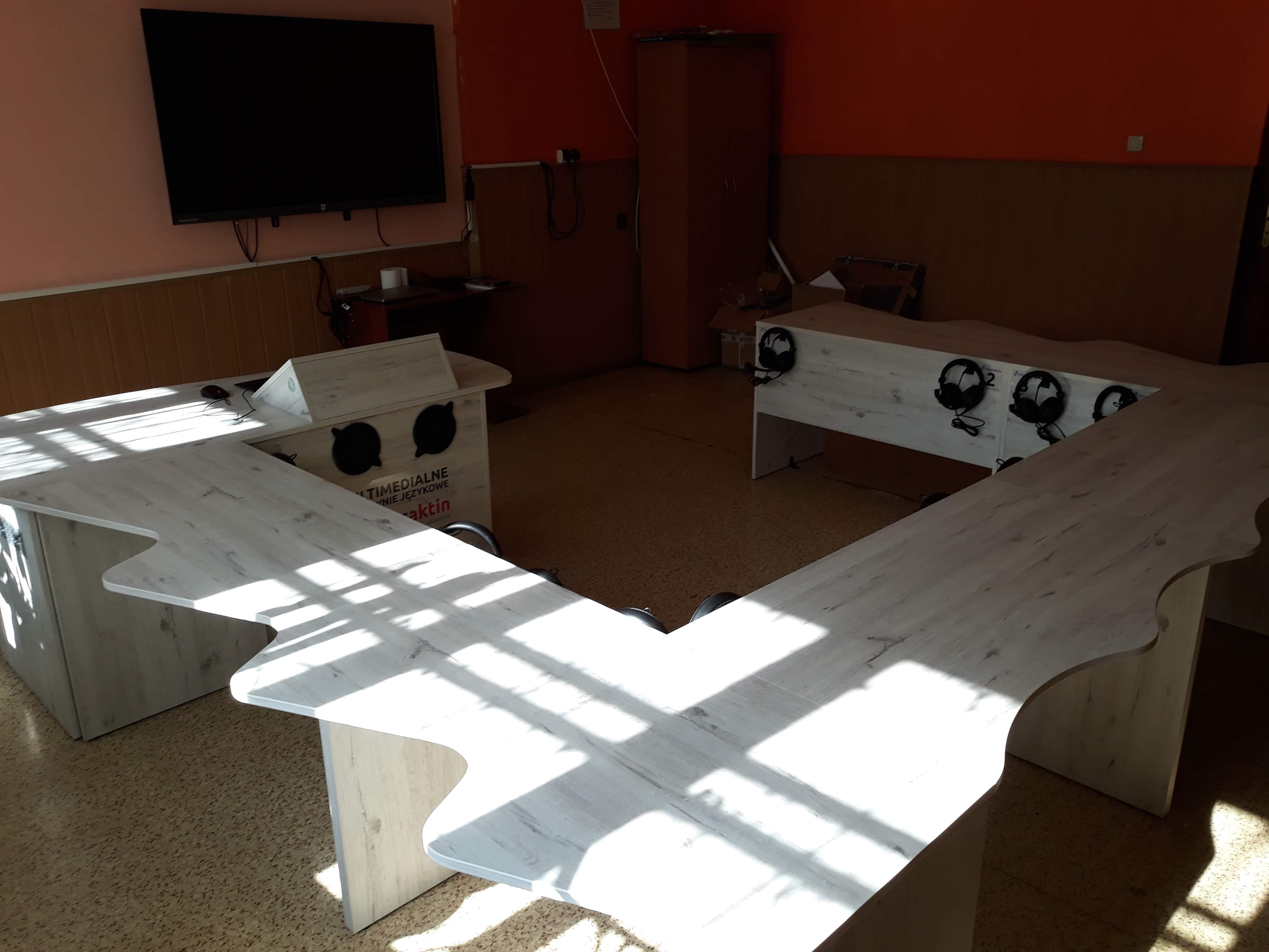 Pracownia językowa 12 stanowisk z wbudowanym monitorem dotykowym w blat nauczyciela.