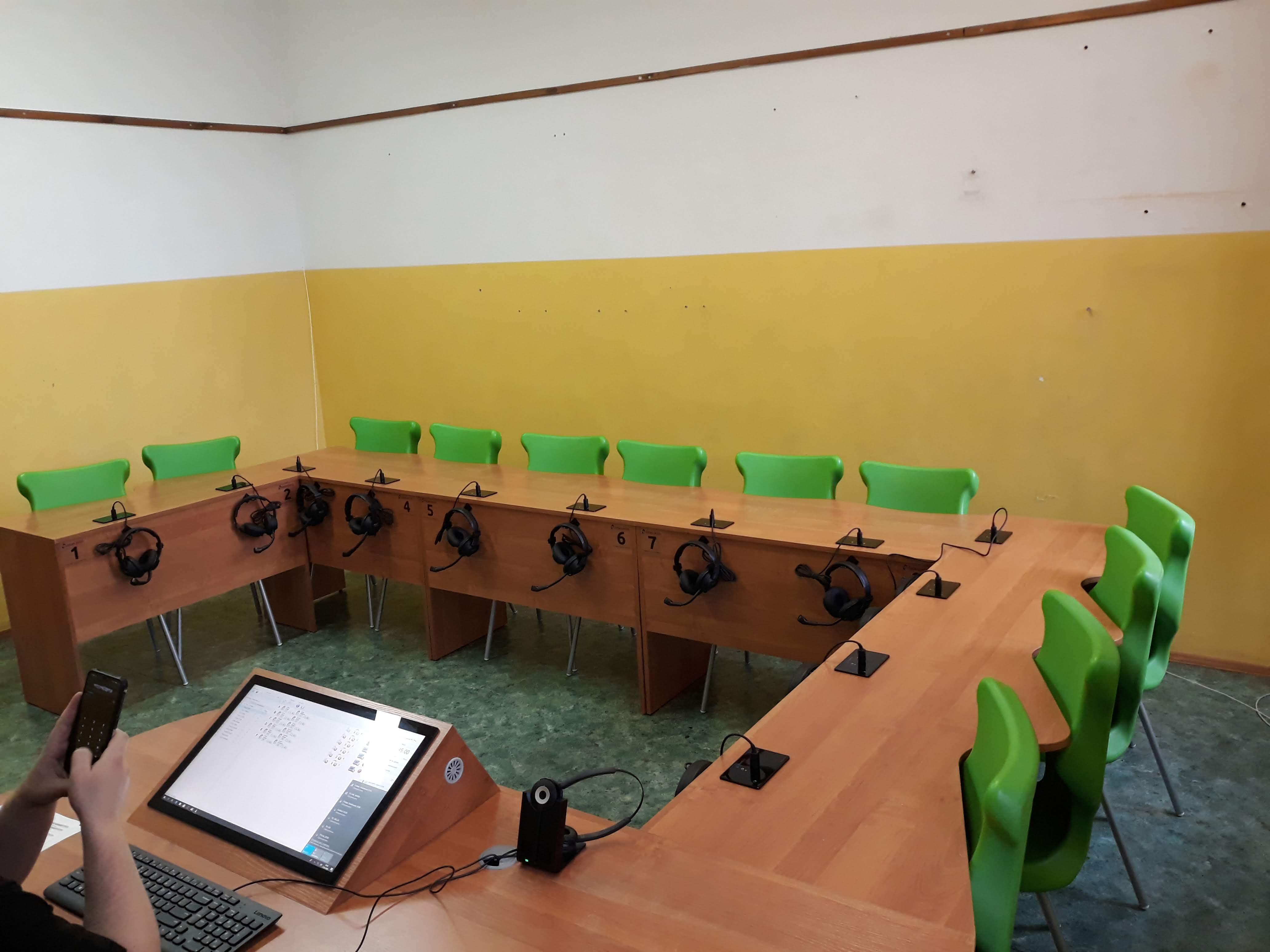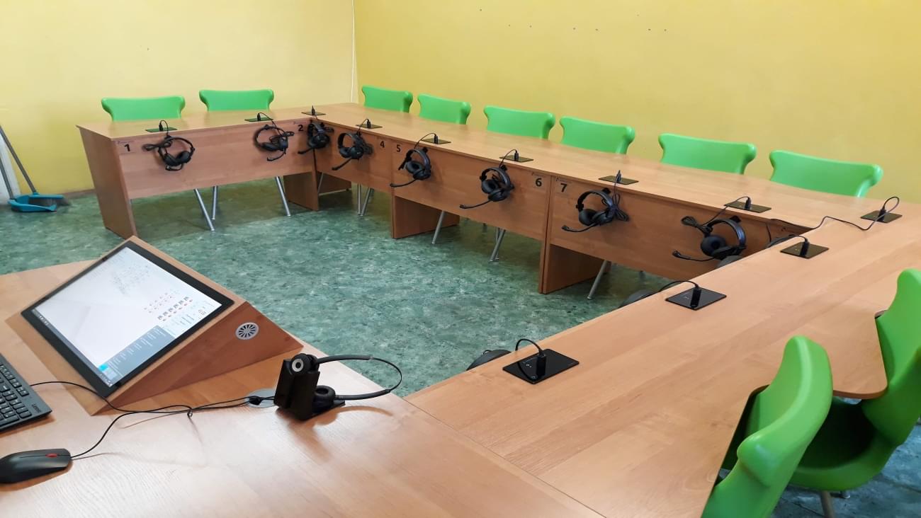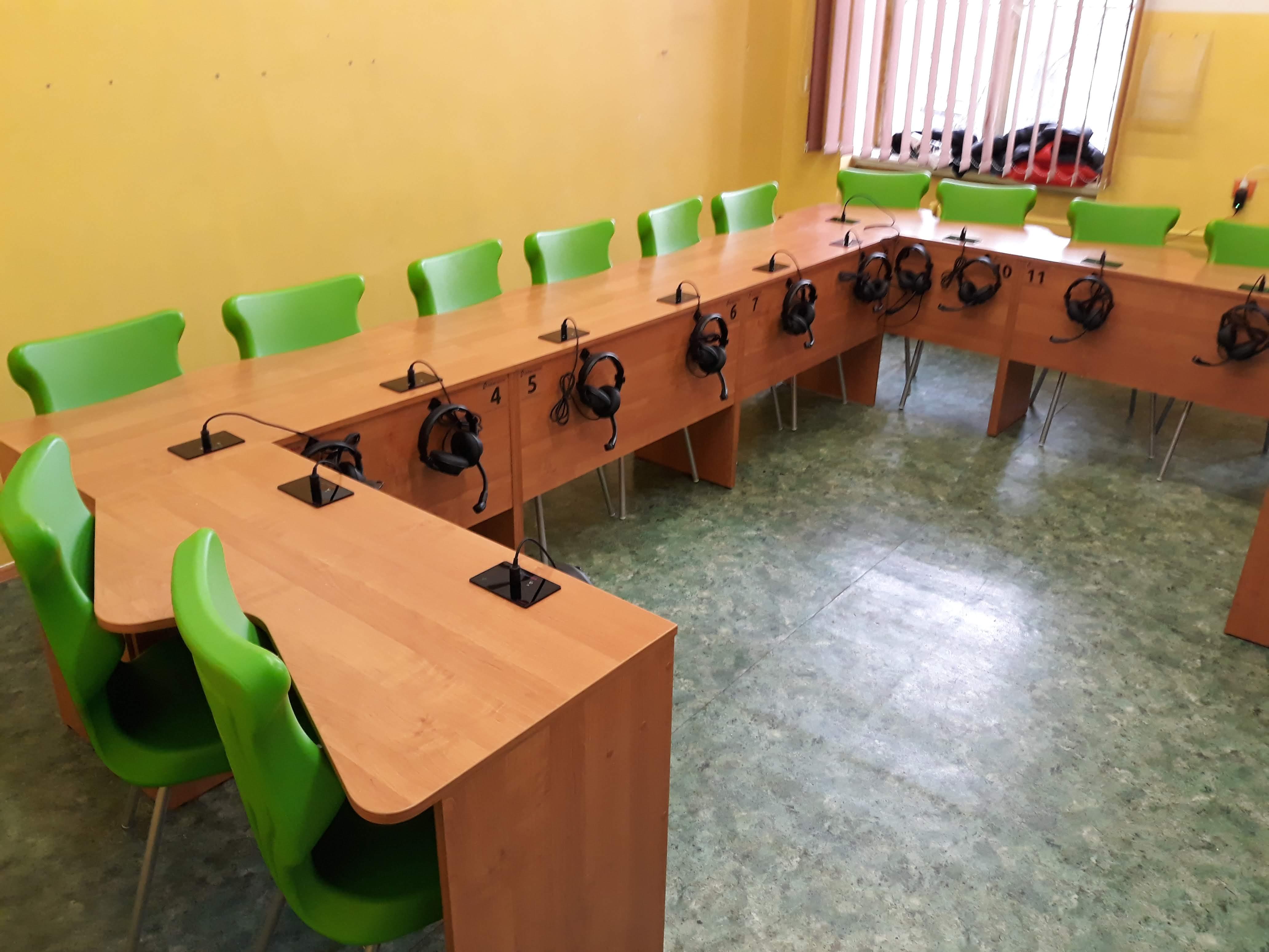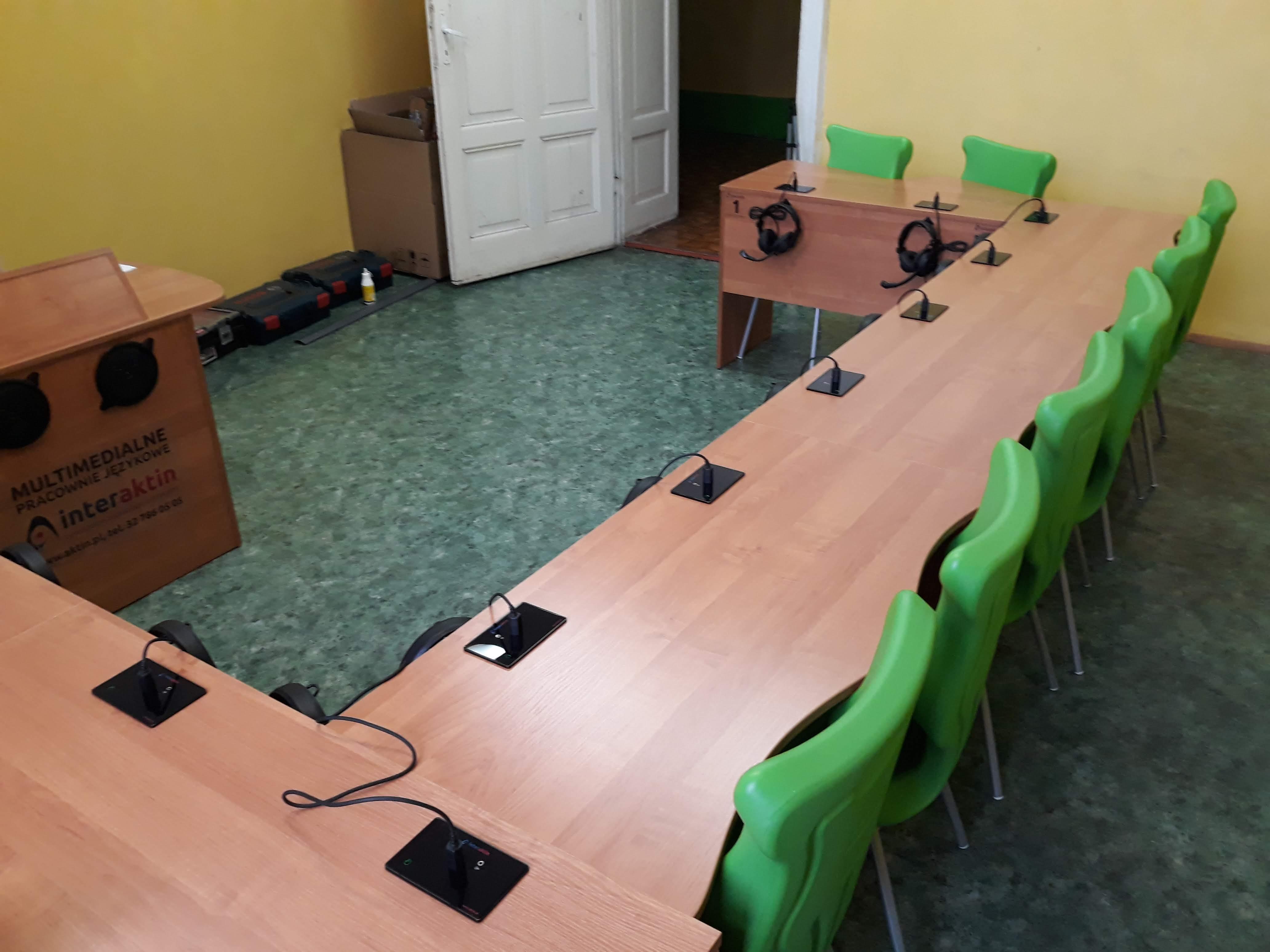 Pracownia językowa 12 stanowisk z pulpitami uczniowskimi i wbudowanym monitorem dotykowym w blat nauczyciela.