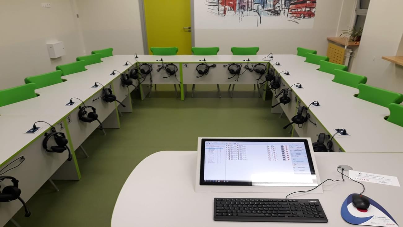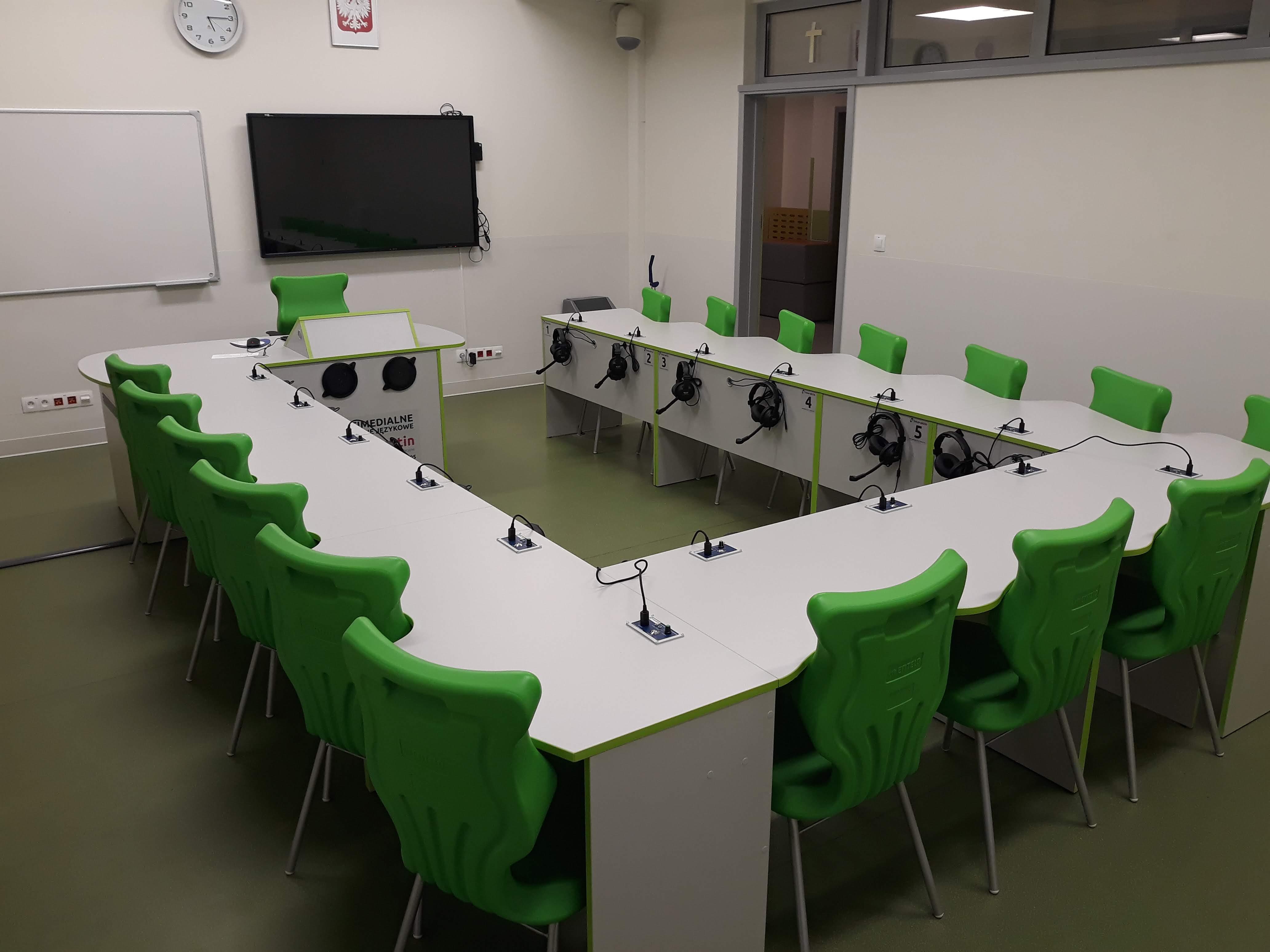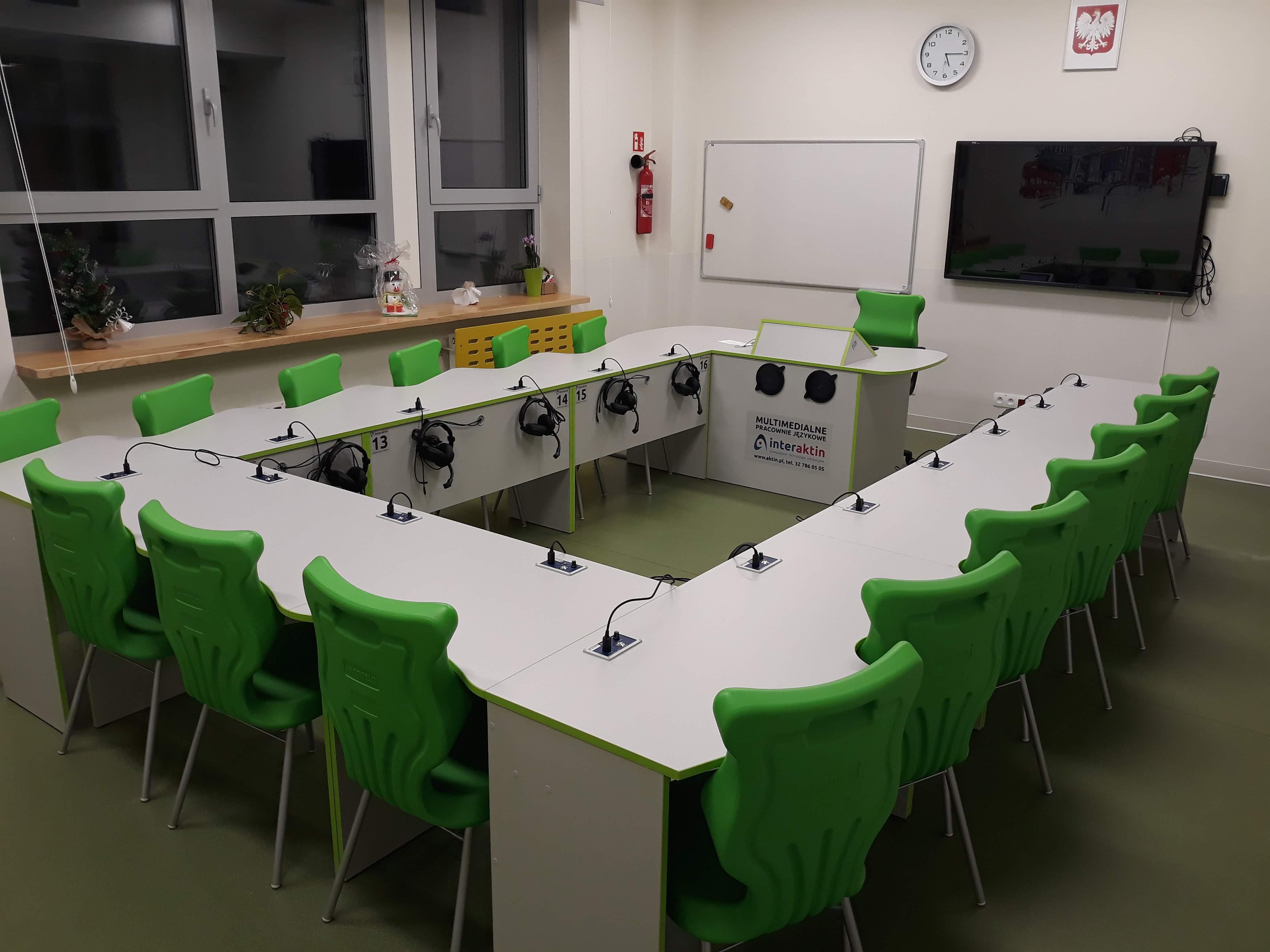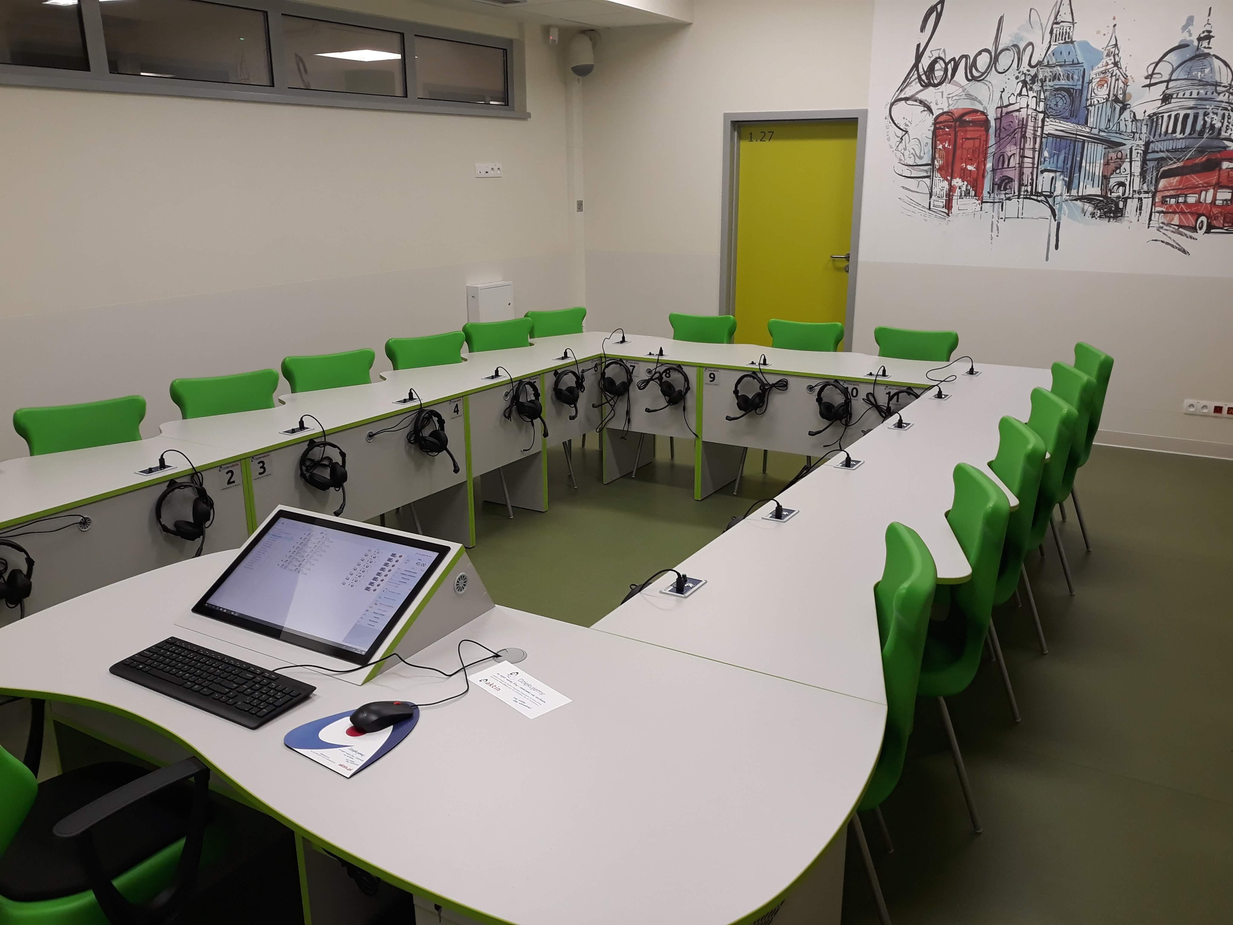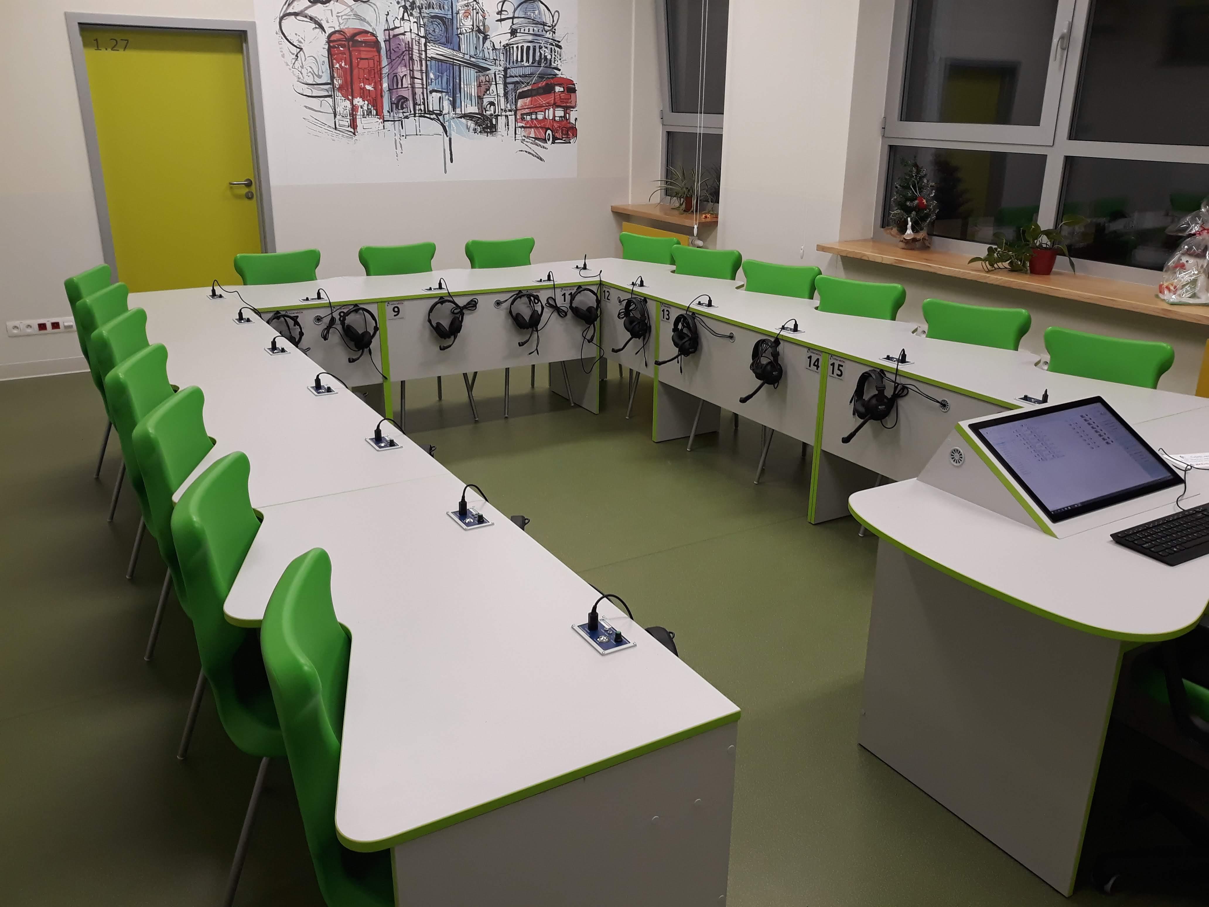 Pracownia językowa 16 stanowisk z pulpitami uczniowskim i wbudowanym monitorem dotykowym w blat nauczyciela.
