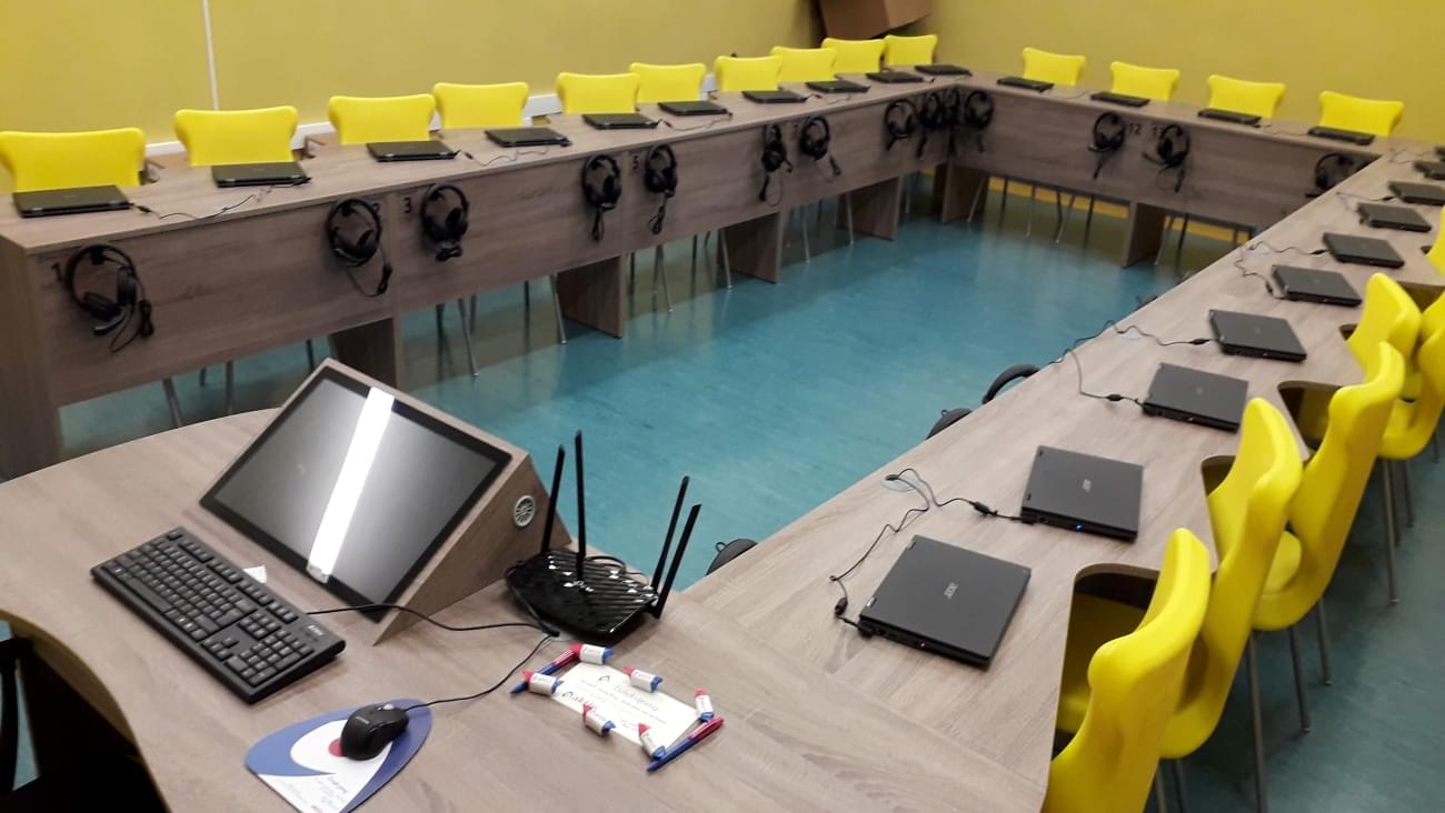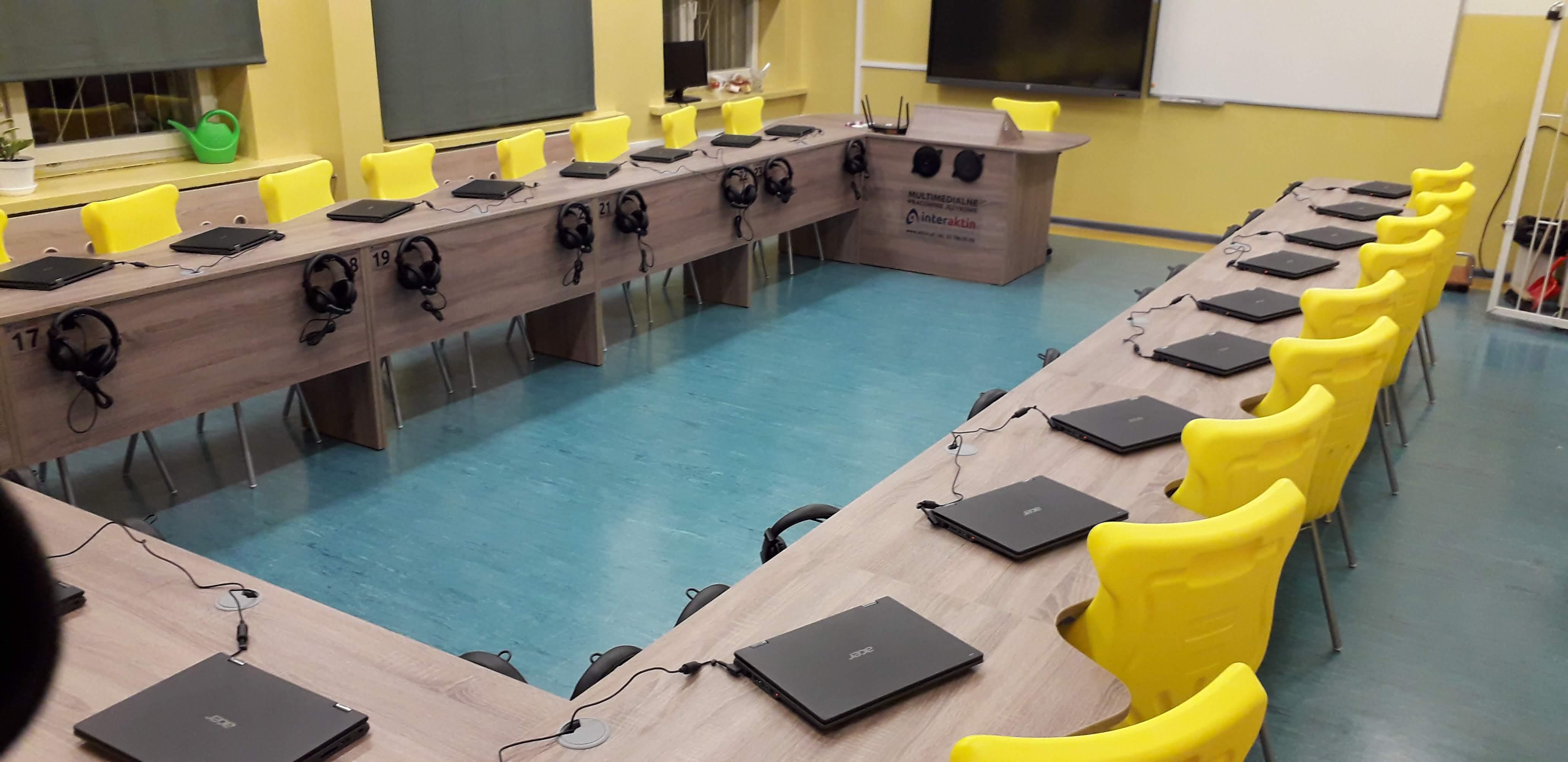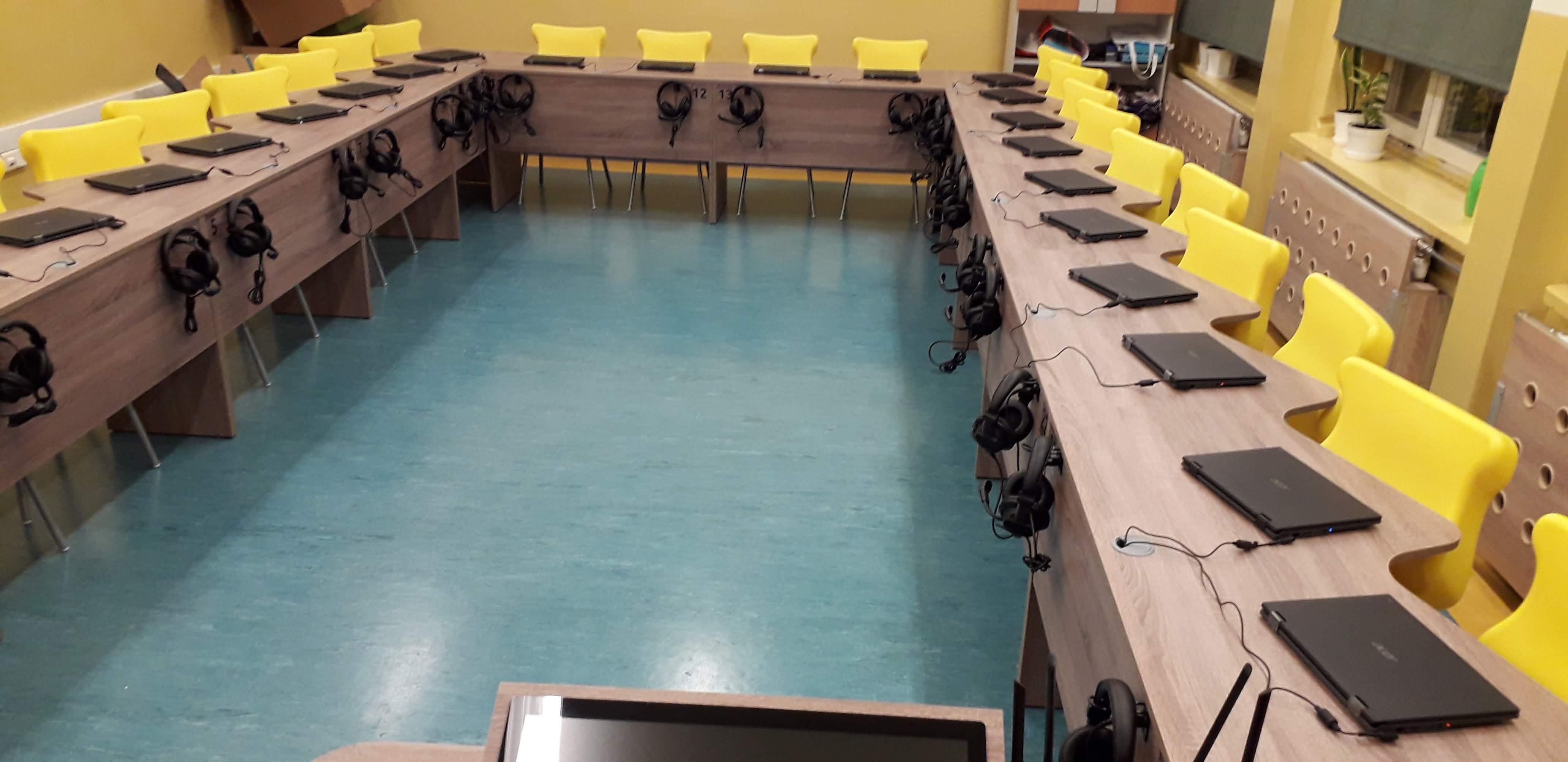 Pracownia językowa 24 stanowiska z wbudowanym monitorem dotykowym w blat nauczyciela i laptopami uczniowskimi w pełni zarządzanymi przez nauczyciela.