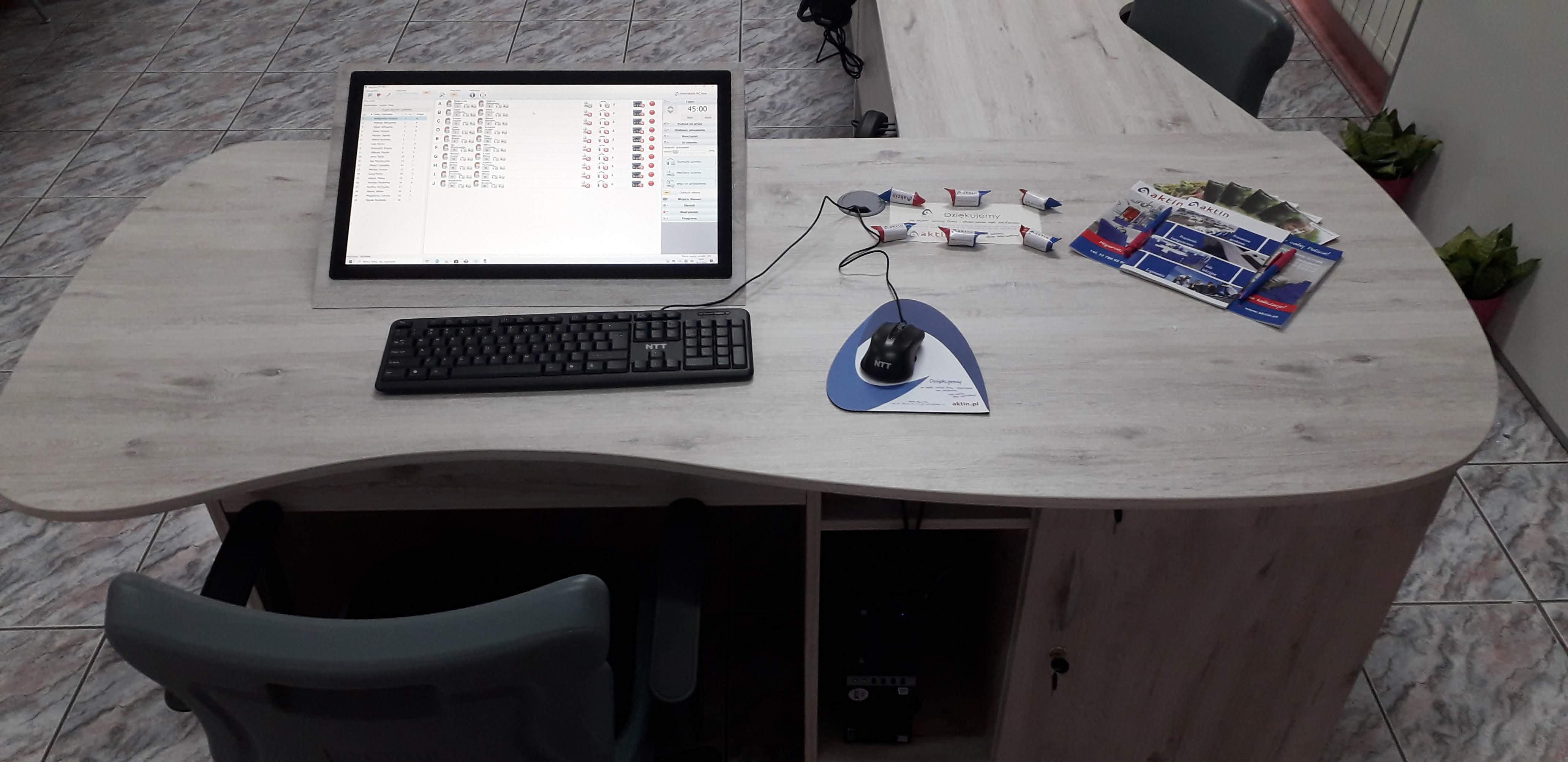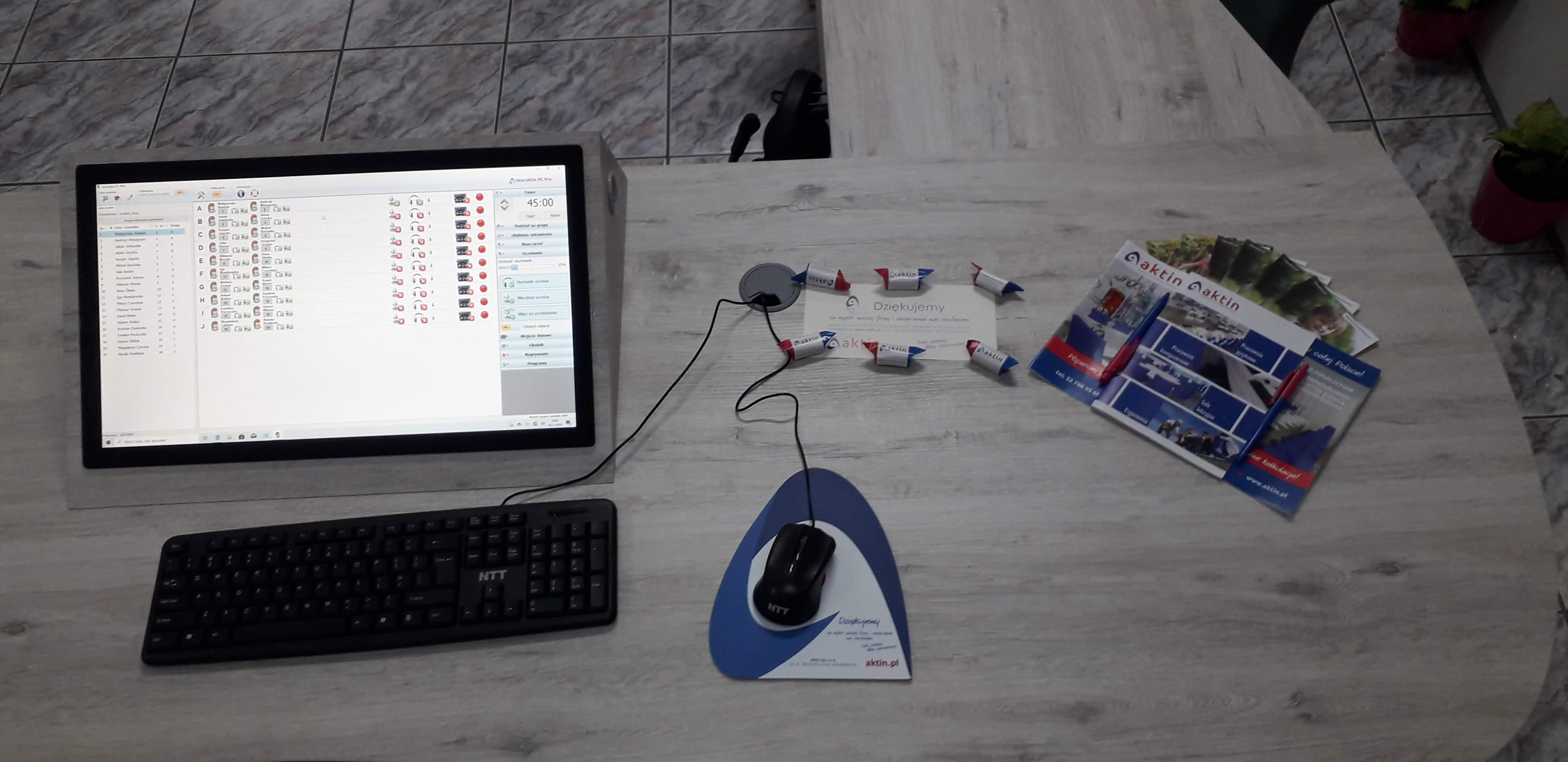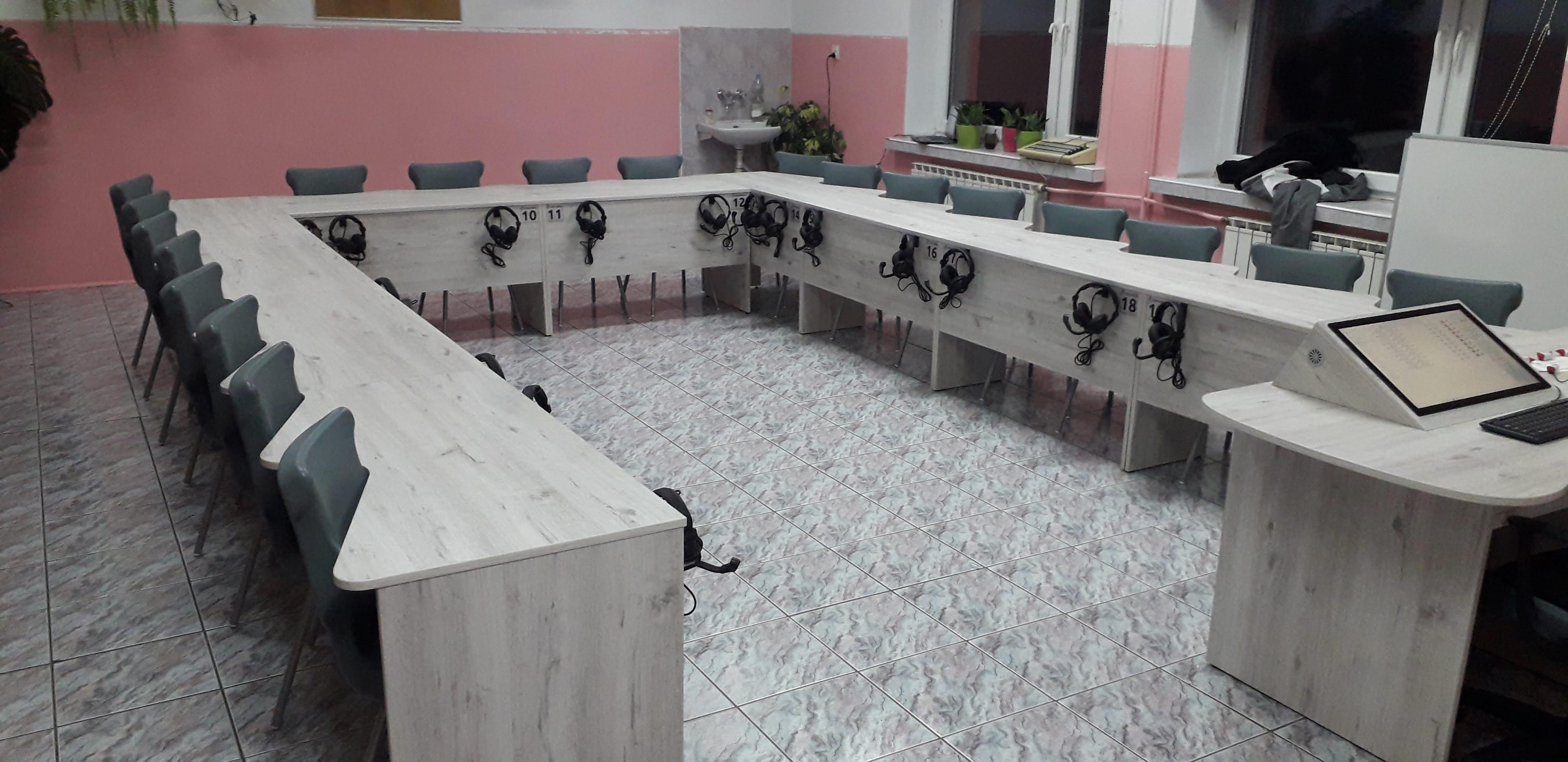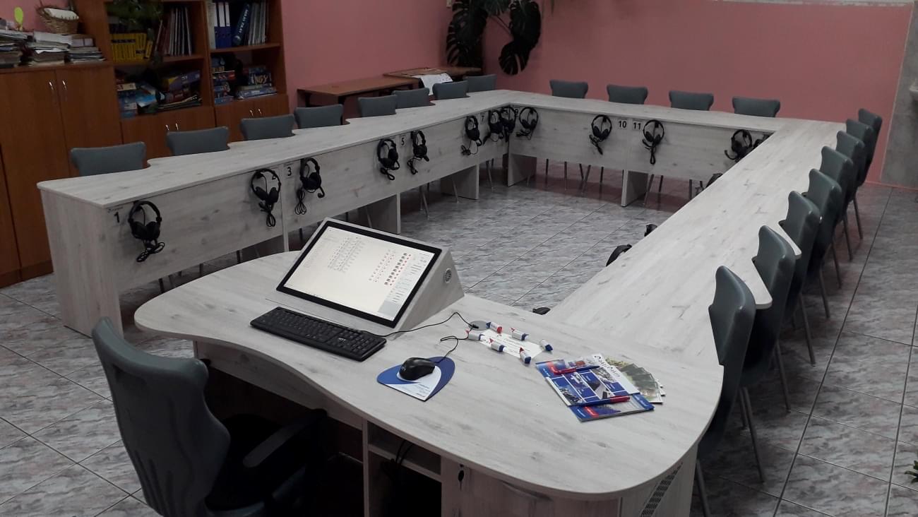 Pracownia językowa 20 stanowisk z wbudowanym monitorem dotykowym w blat nauczyciela.