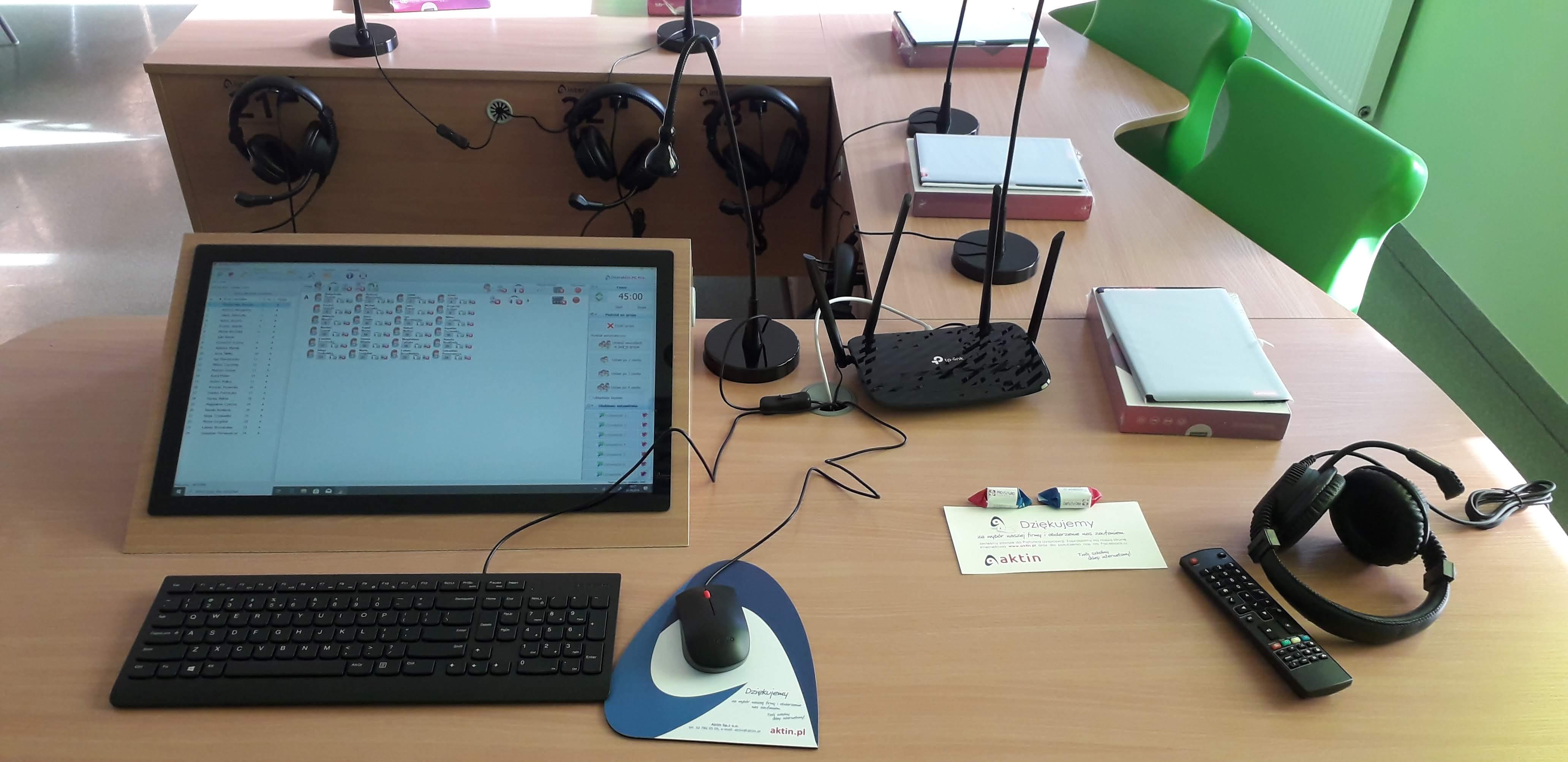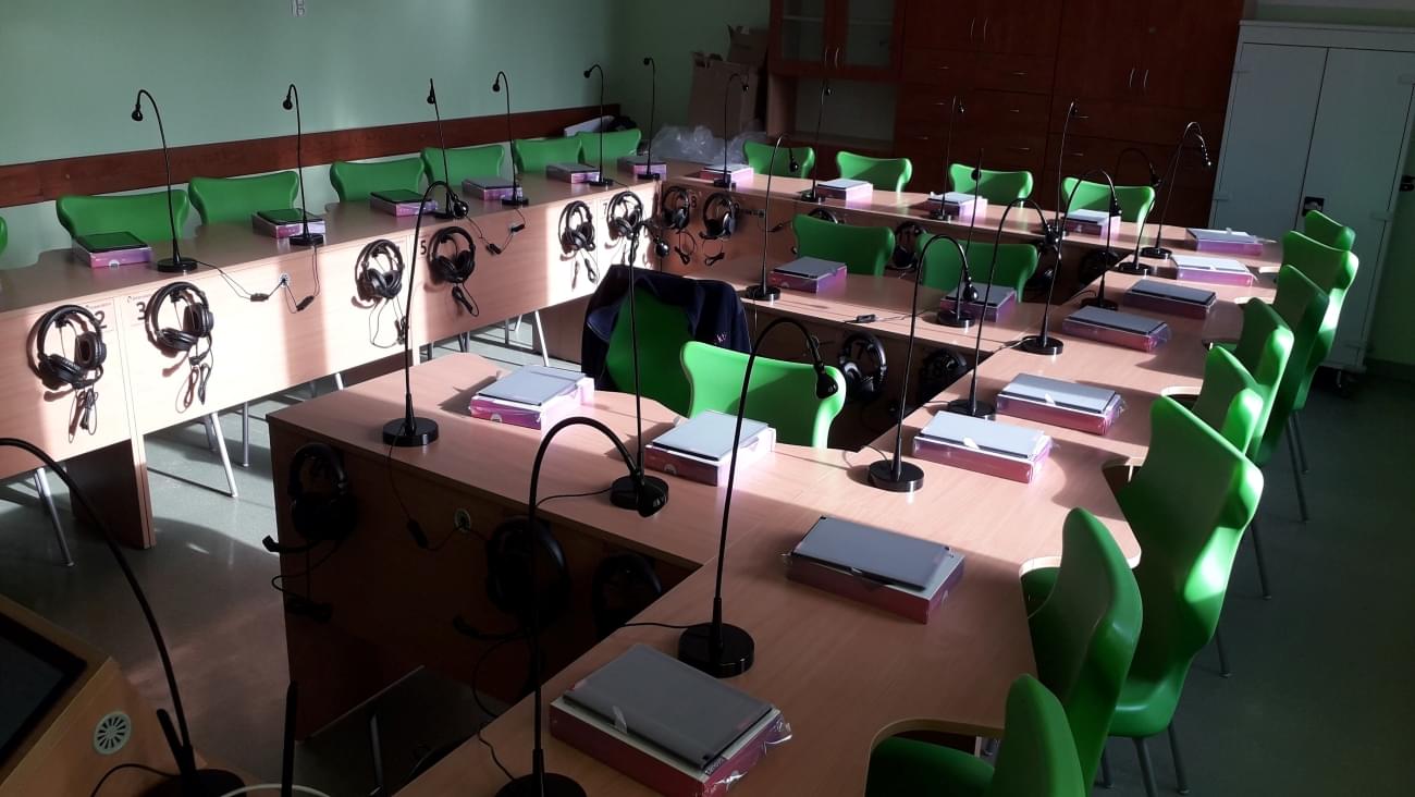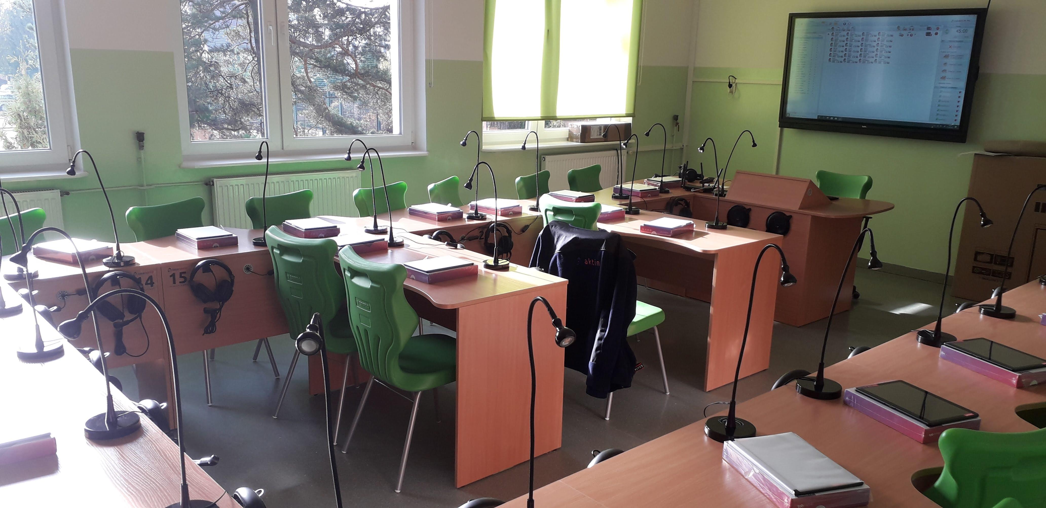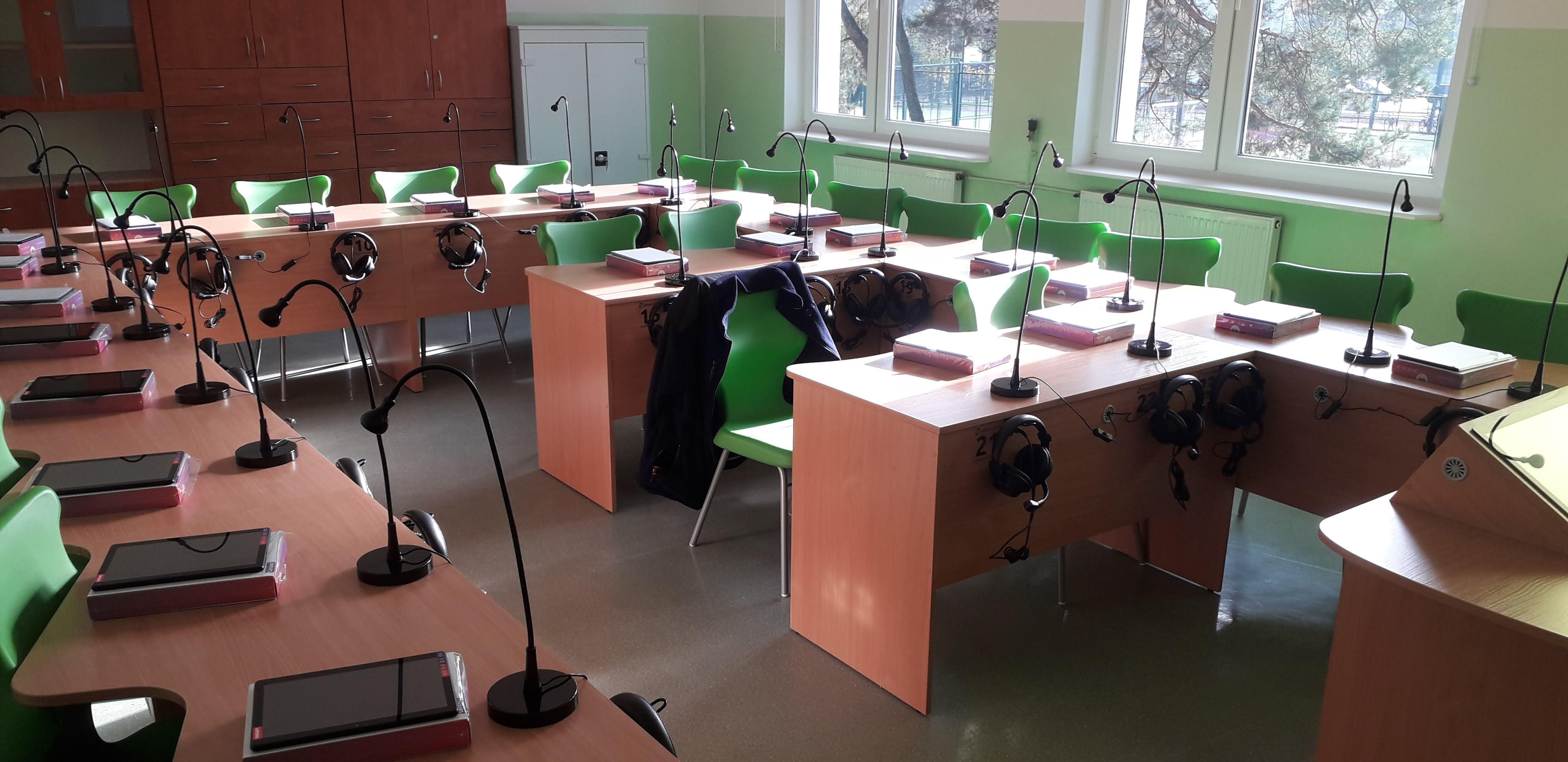 Pracownia językowa 24 stanowiska z wbudowanym monitorem dotykowym w blat nauczyciela , lampkami uczniowskimi w celu doświetlenia miejsca pracy i tabletami służącymi do przeprowadzania testów.