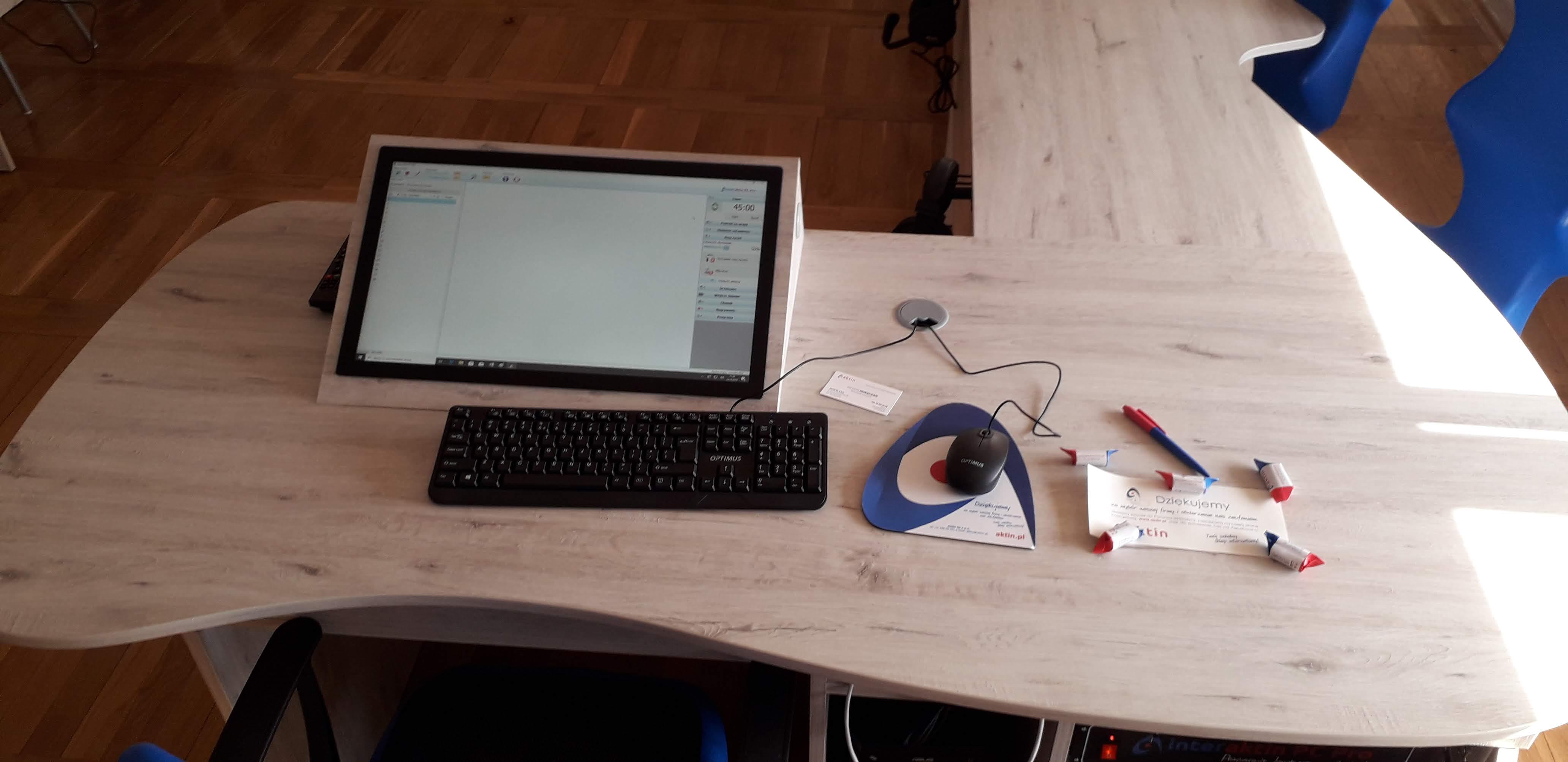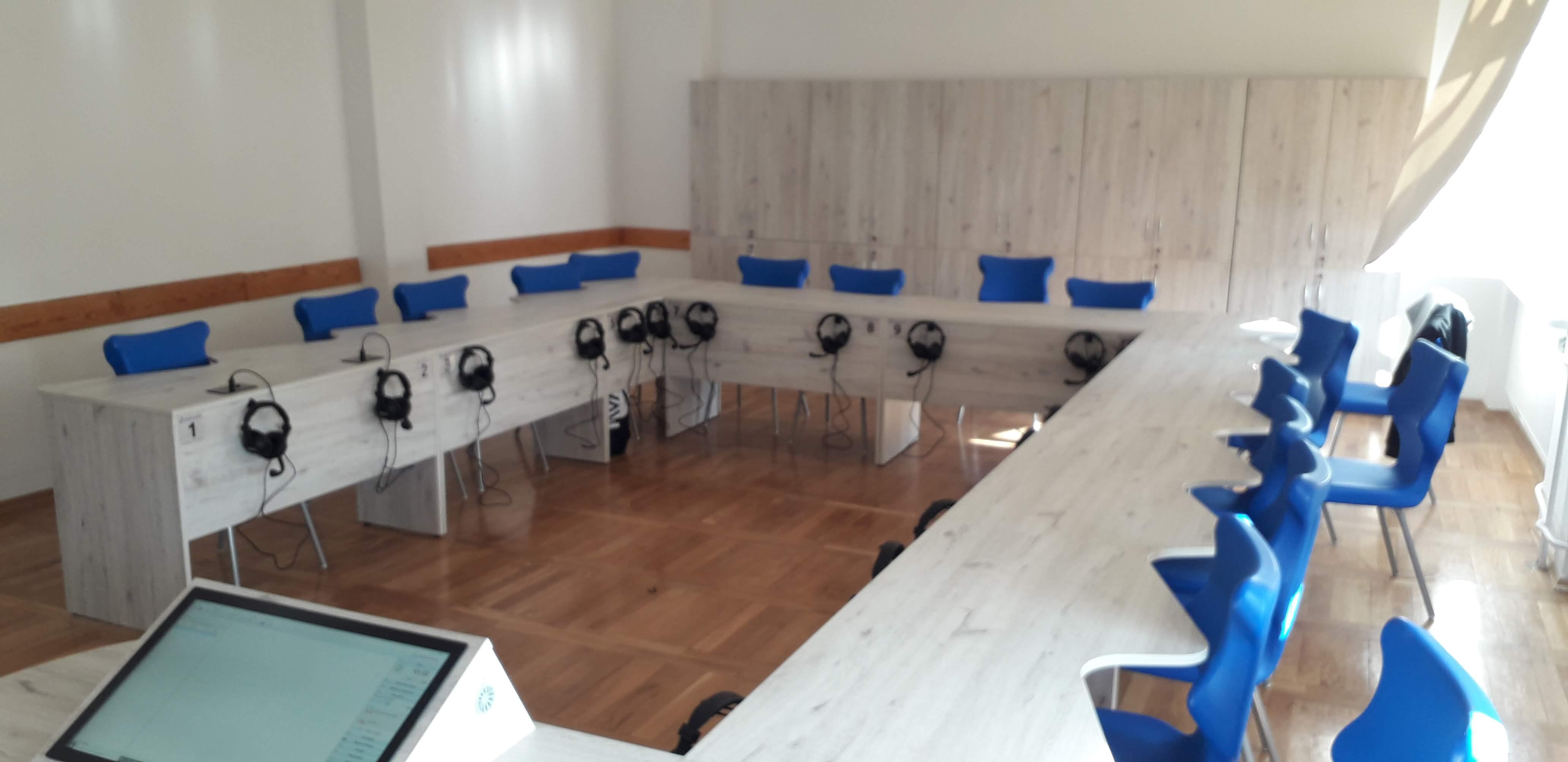 Pracownia językowa 18 stanowisk z wbudowanym monitorem dotykowym w blat nauczyciela.