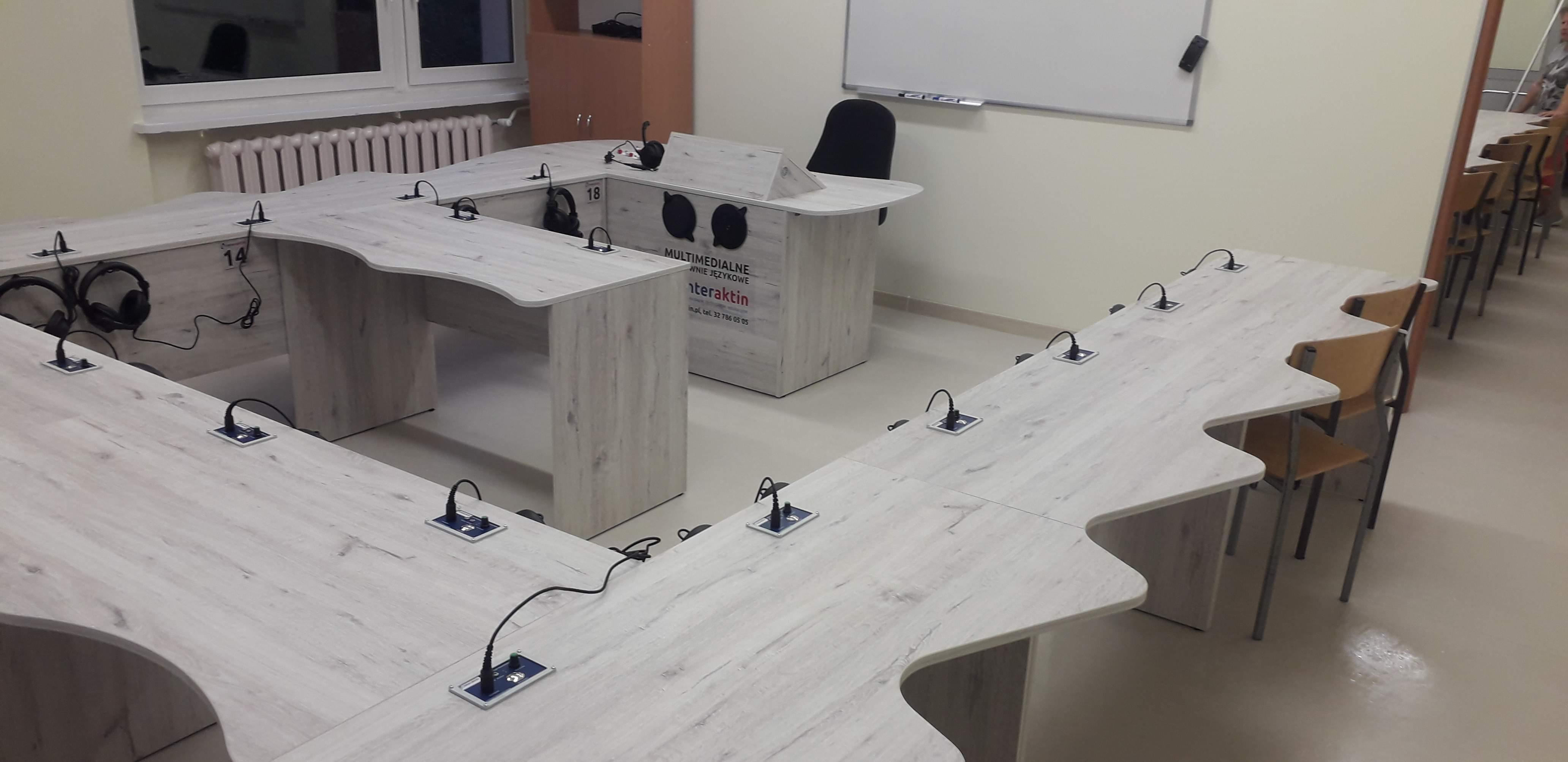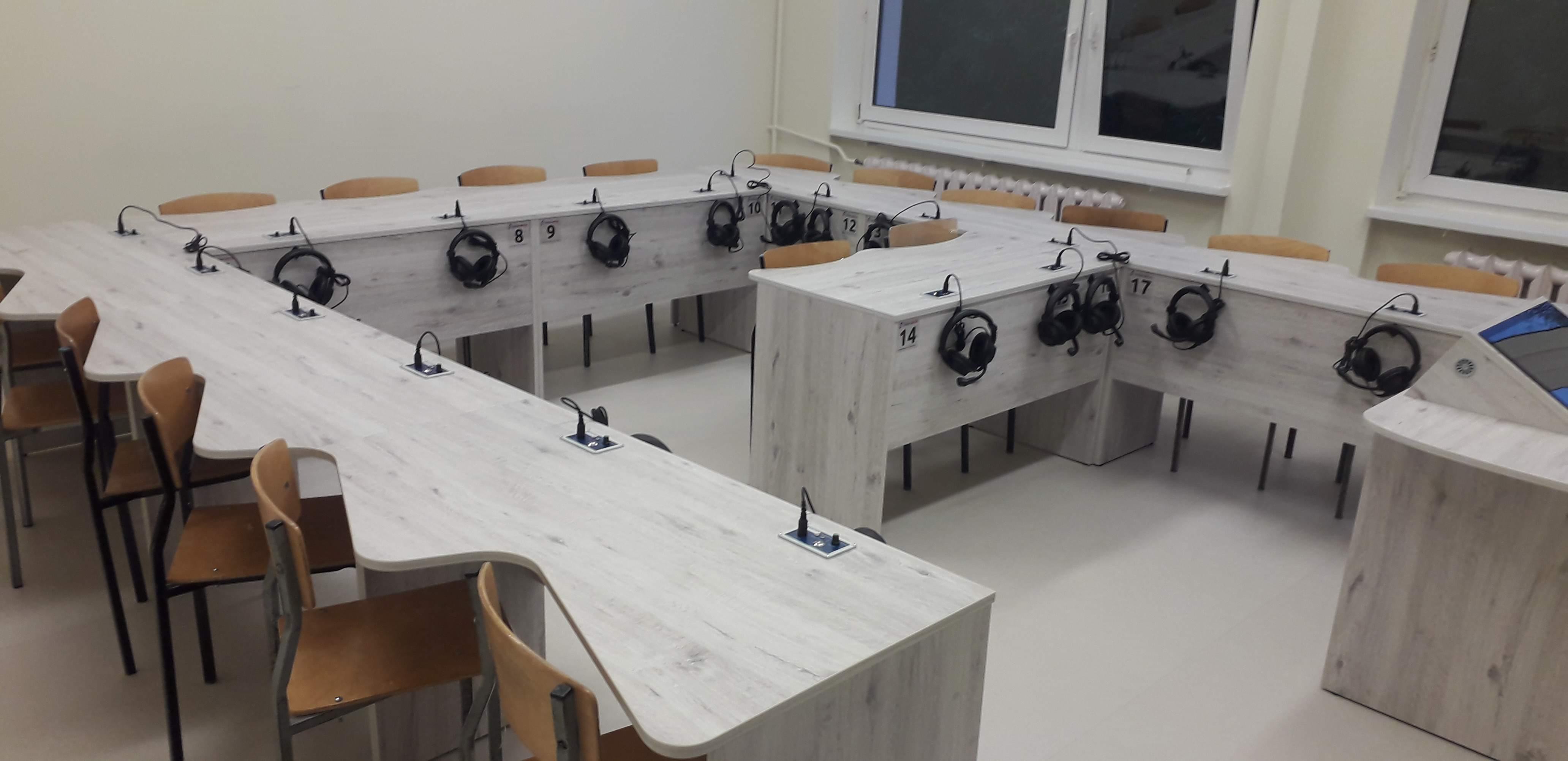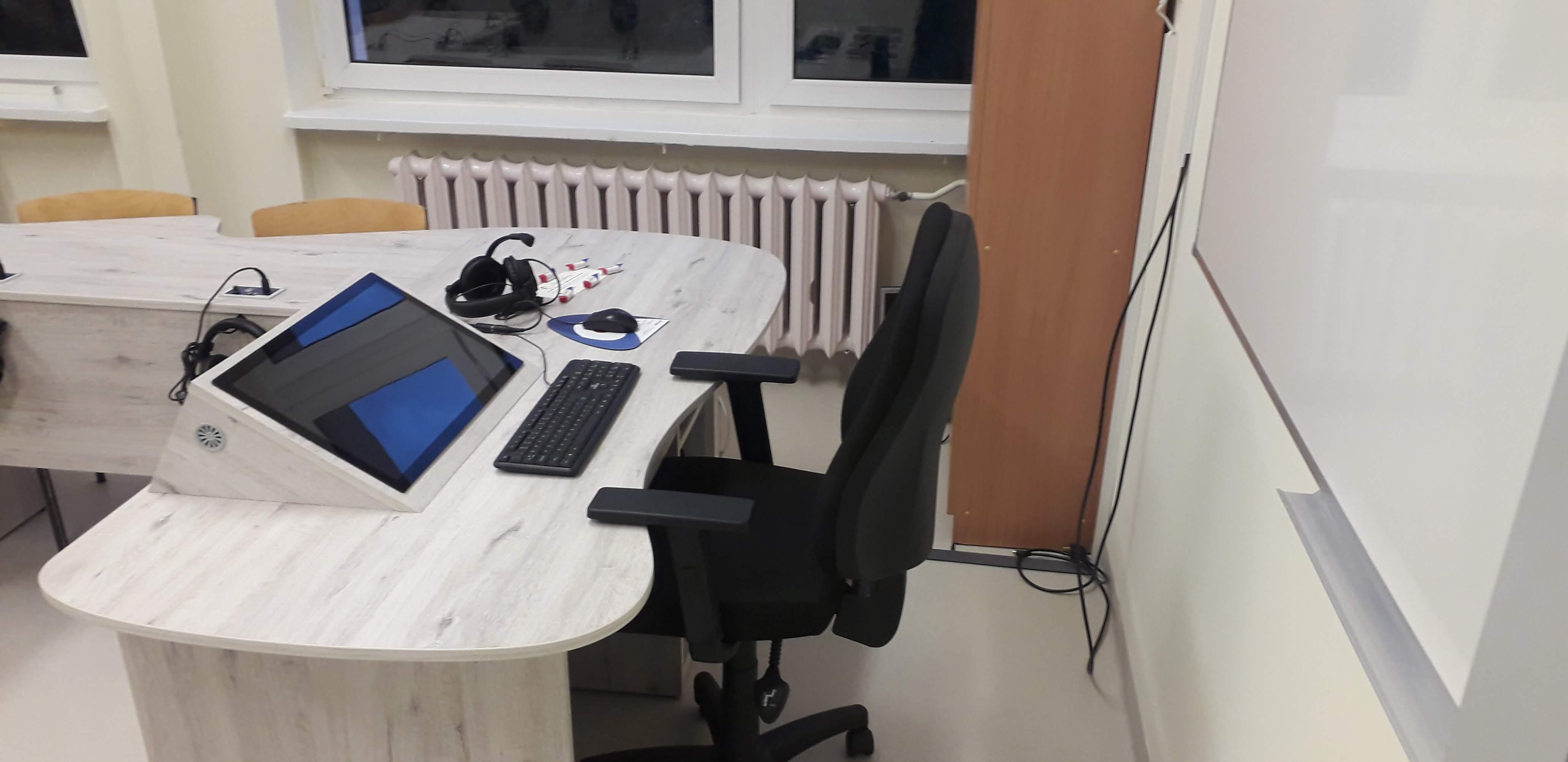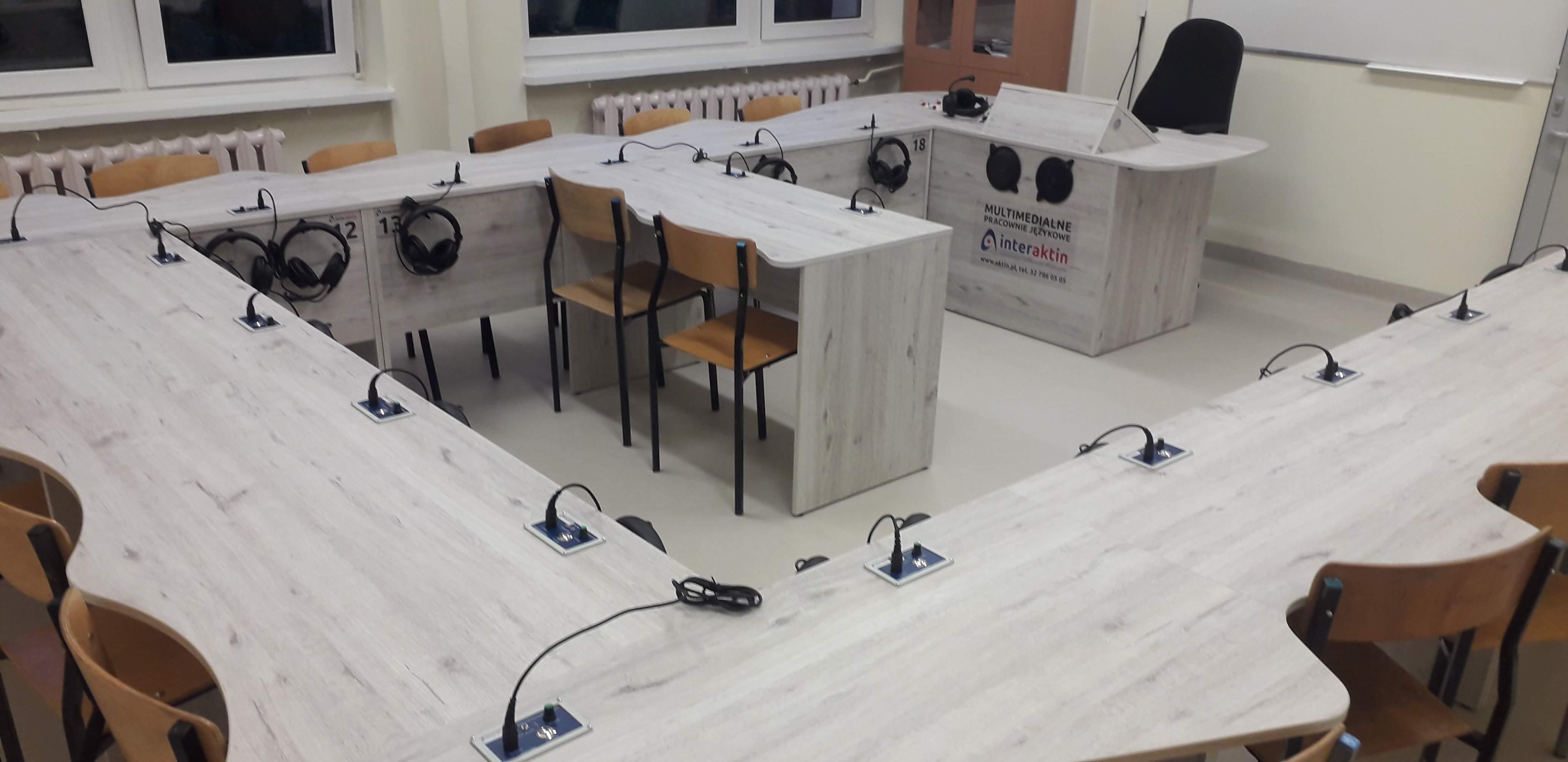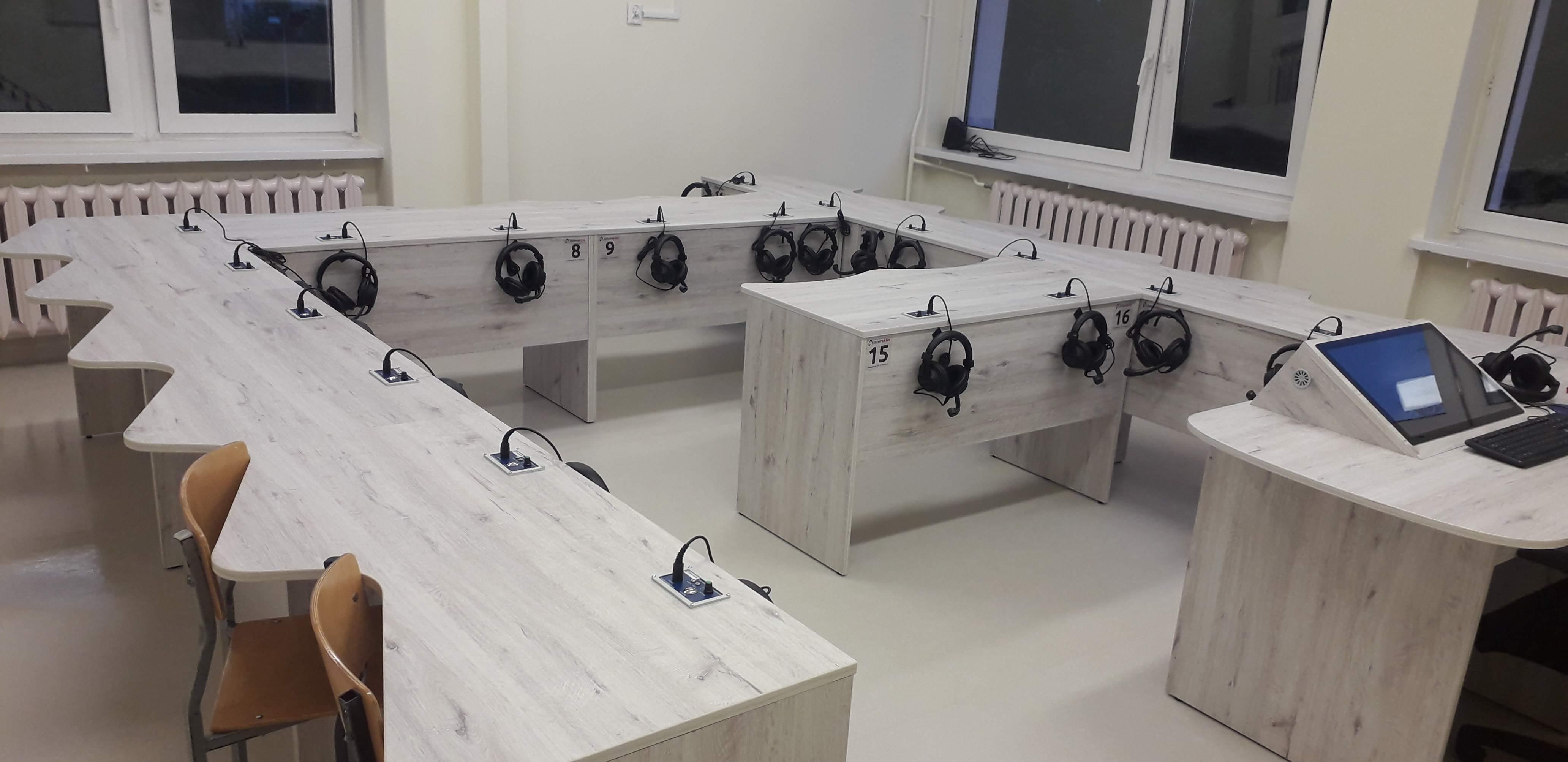 Dwie pracownie językowe 18 stanowiskowe z pulpitami uczniowskimi i wbudowanymi monitorami dotykowymi w blat nauczyciela.
