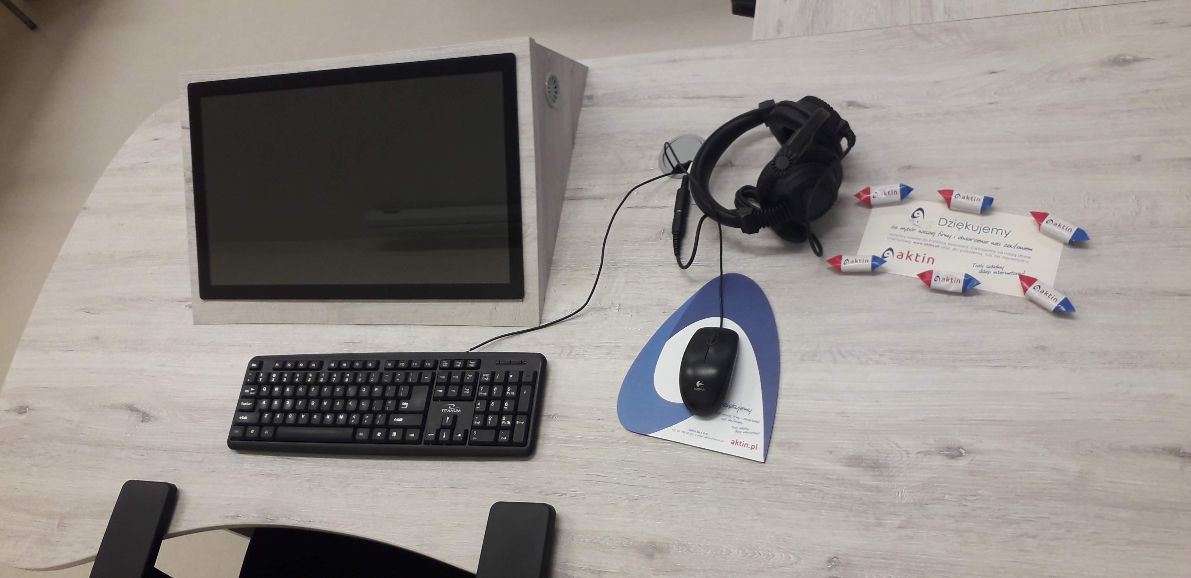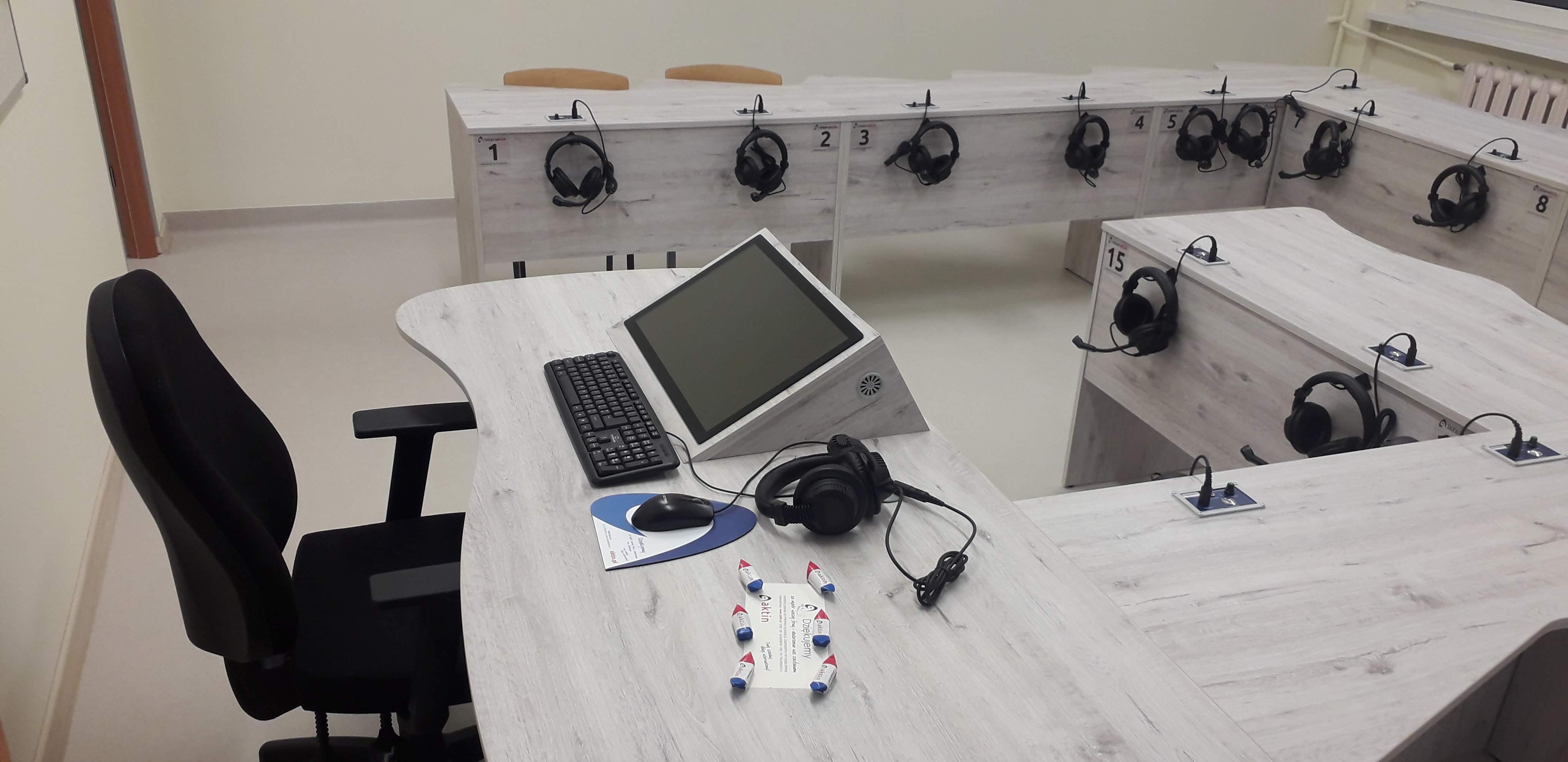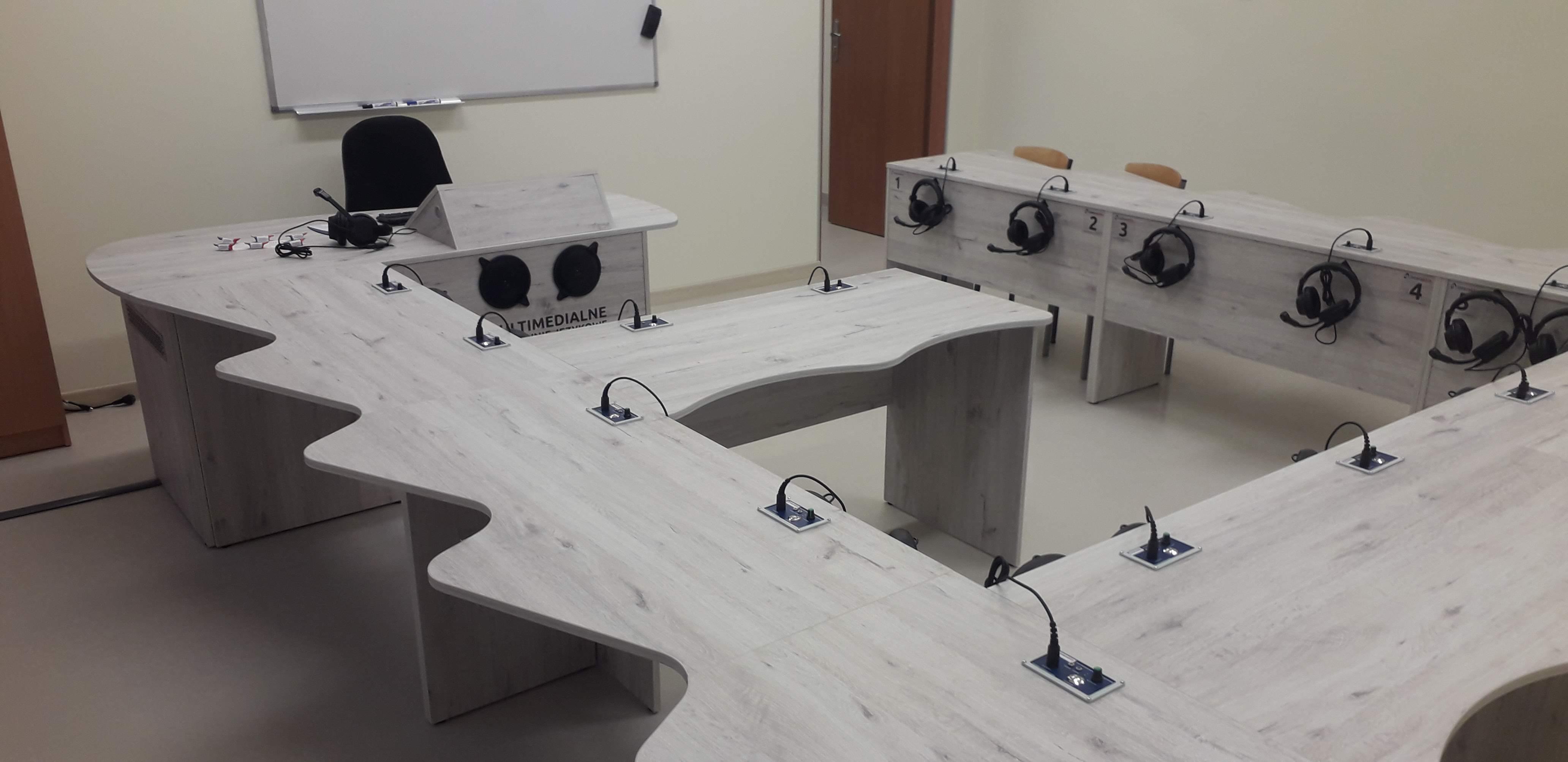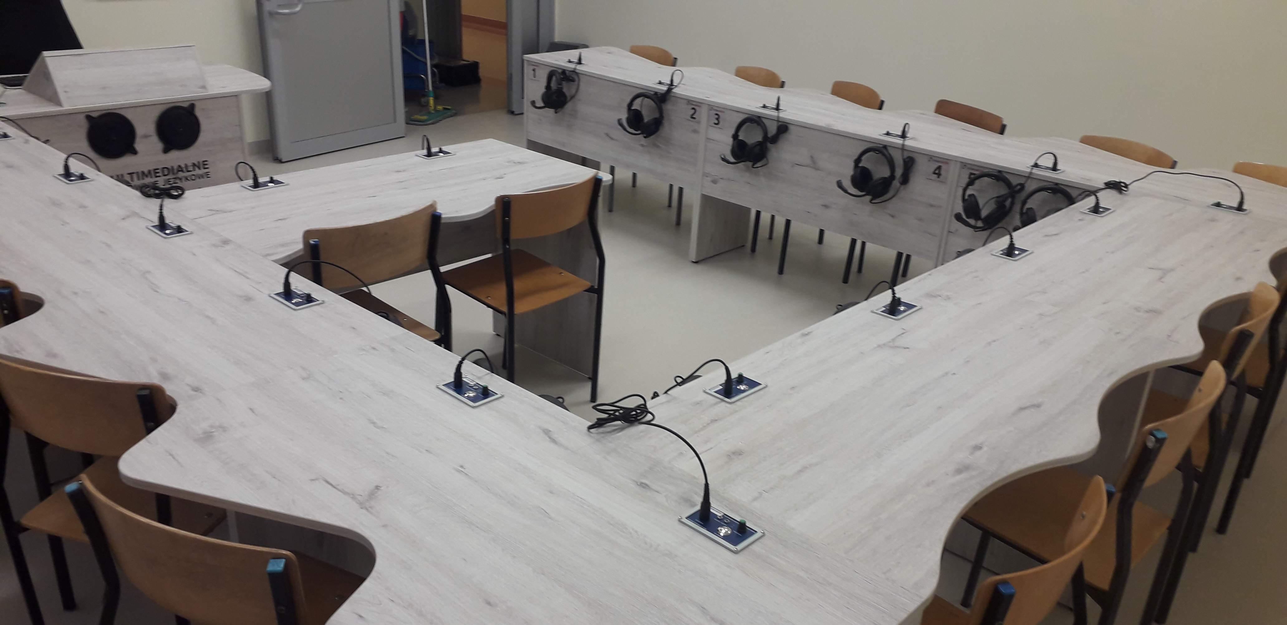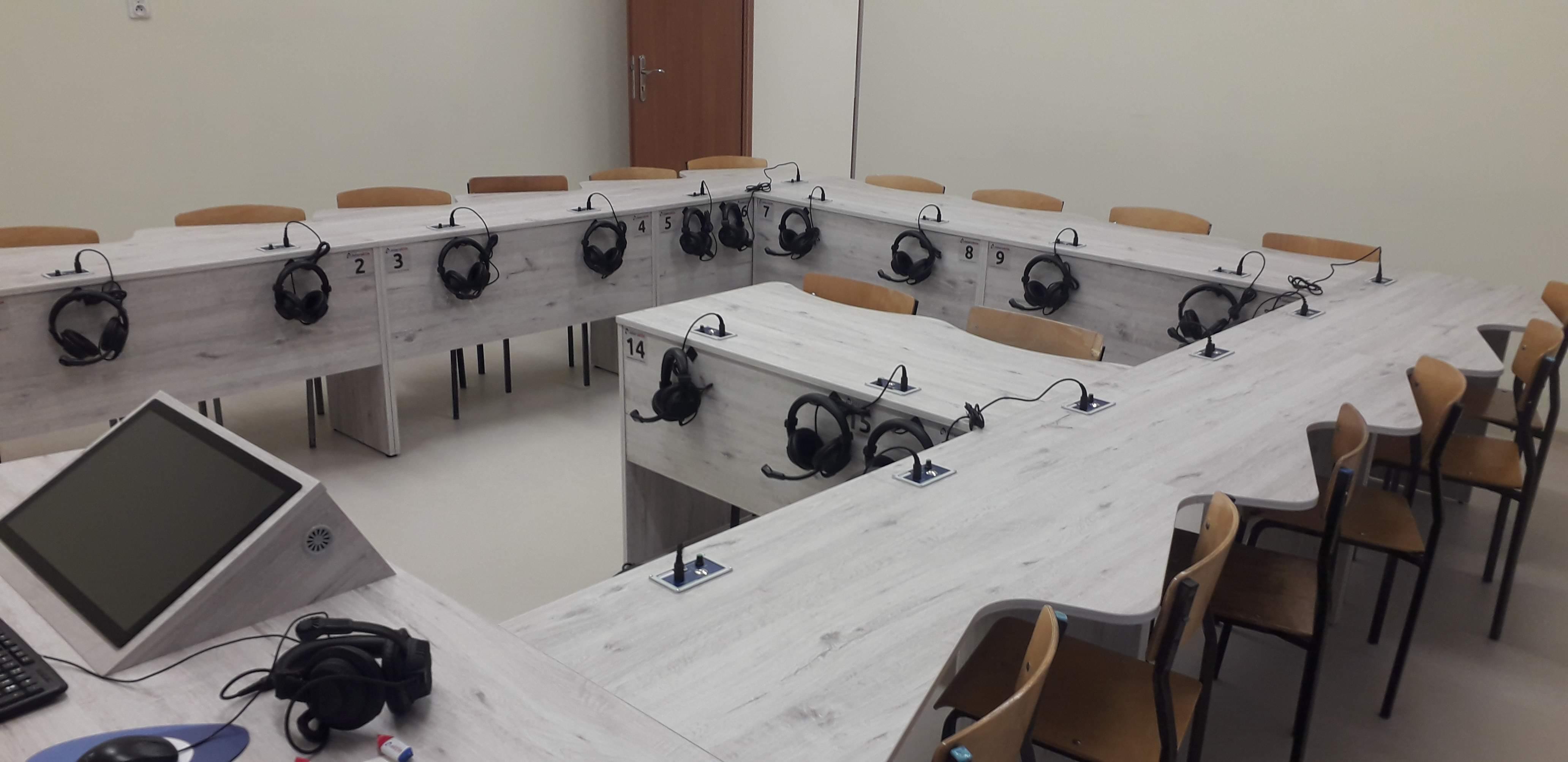 Dwie pracownie językowe 18 stanowiskowe z pulpitami uczniowskimi i wbudowanymi monitorami dotykowymi w blat nauczyciela.