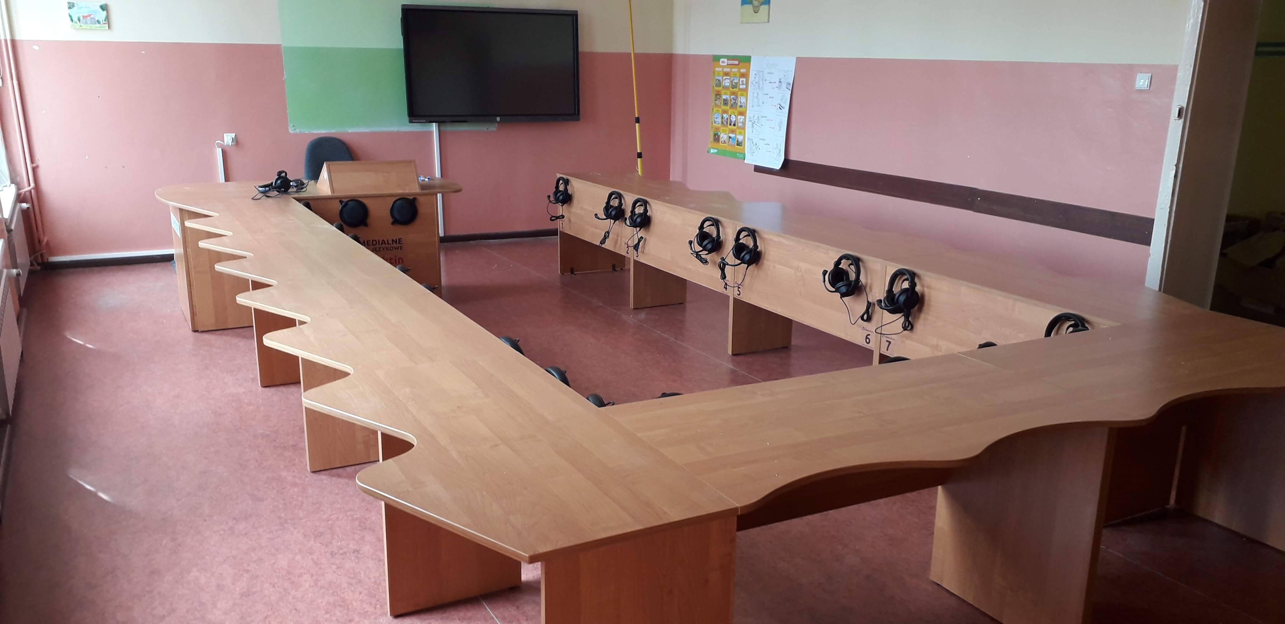 Pracownia językowa 20 stanowisk z wbudowanym monitorem dotykowym w blat nauczyciela.