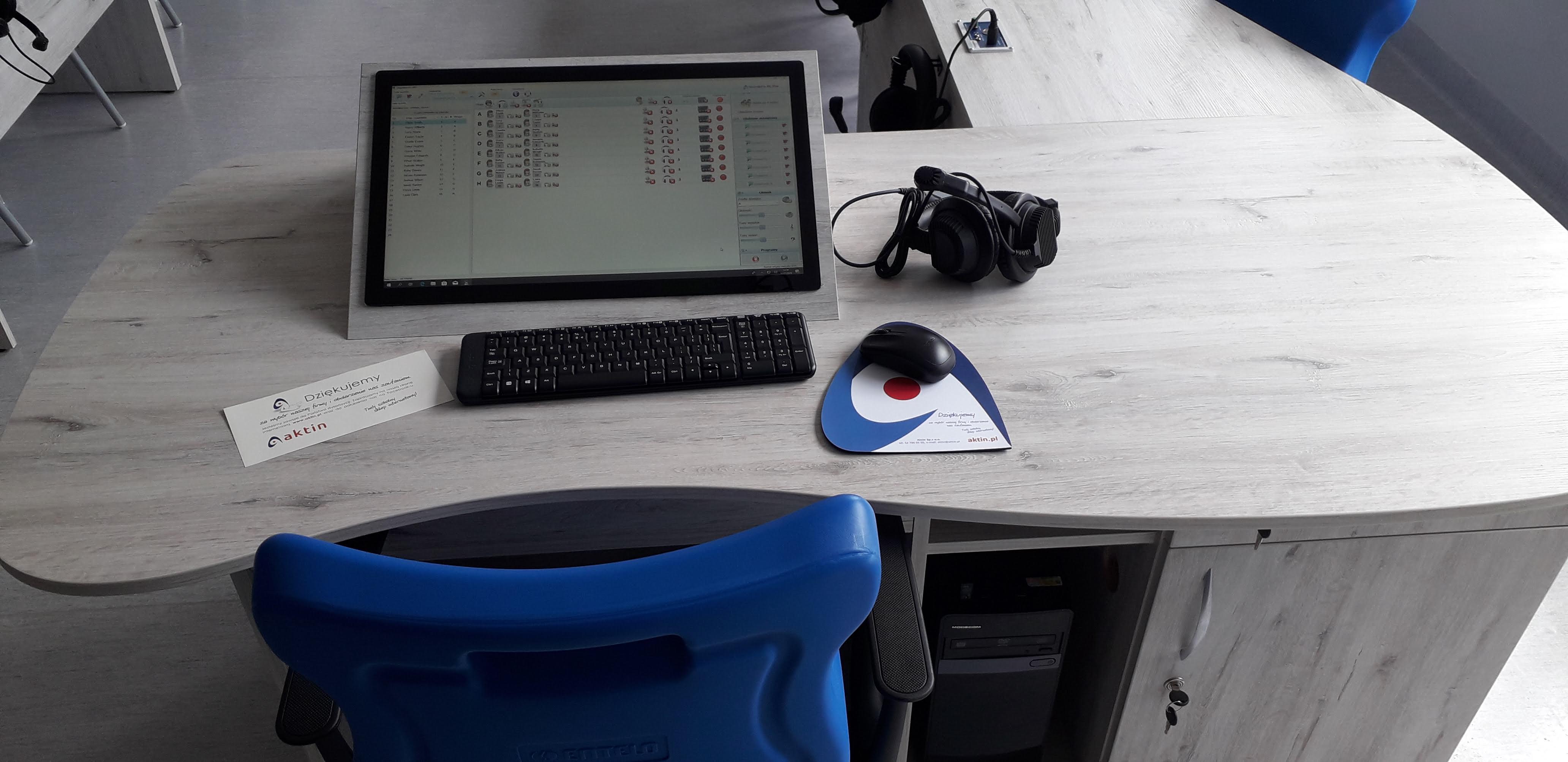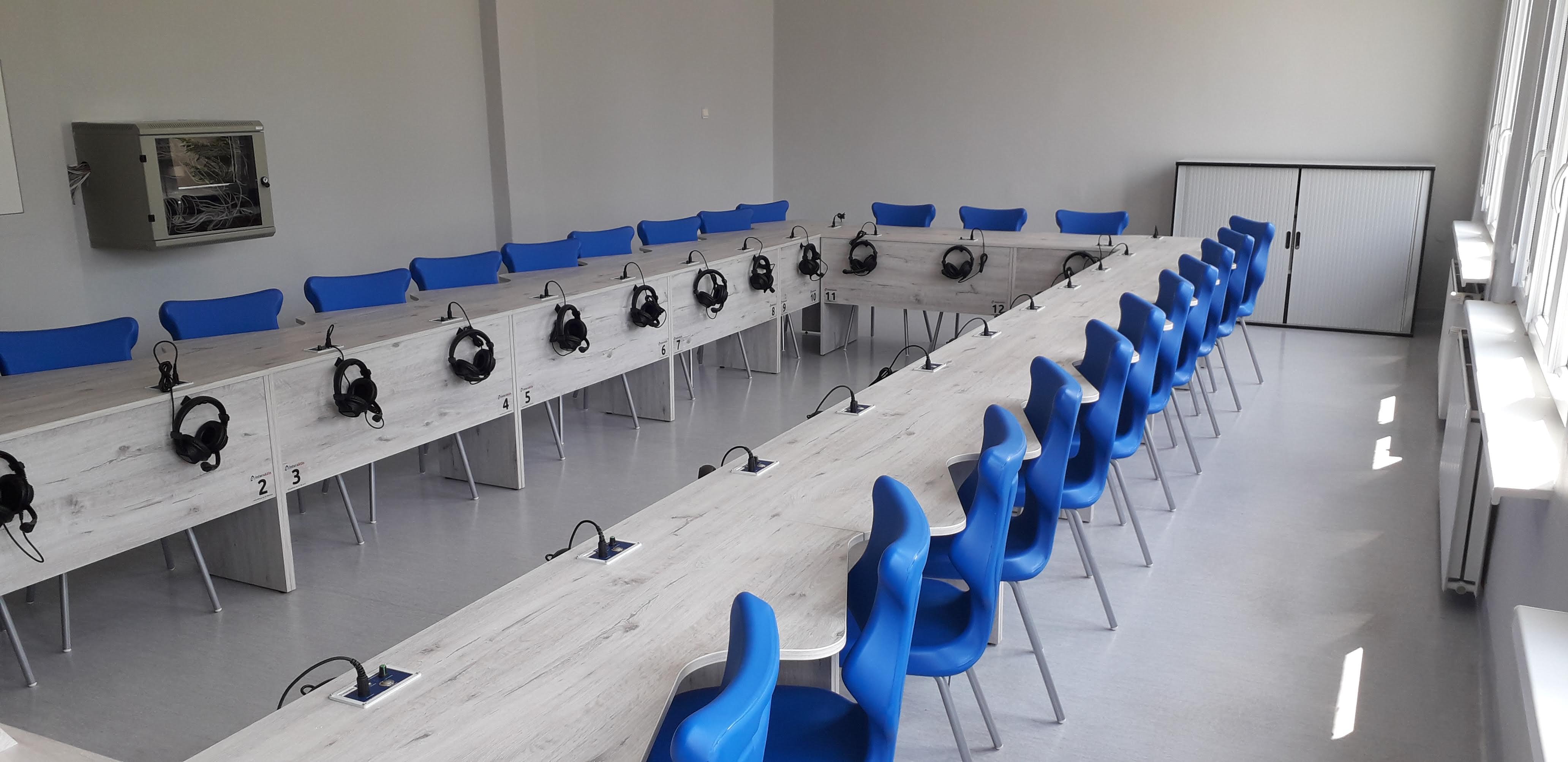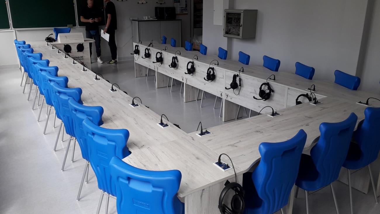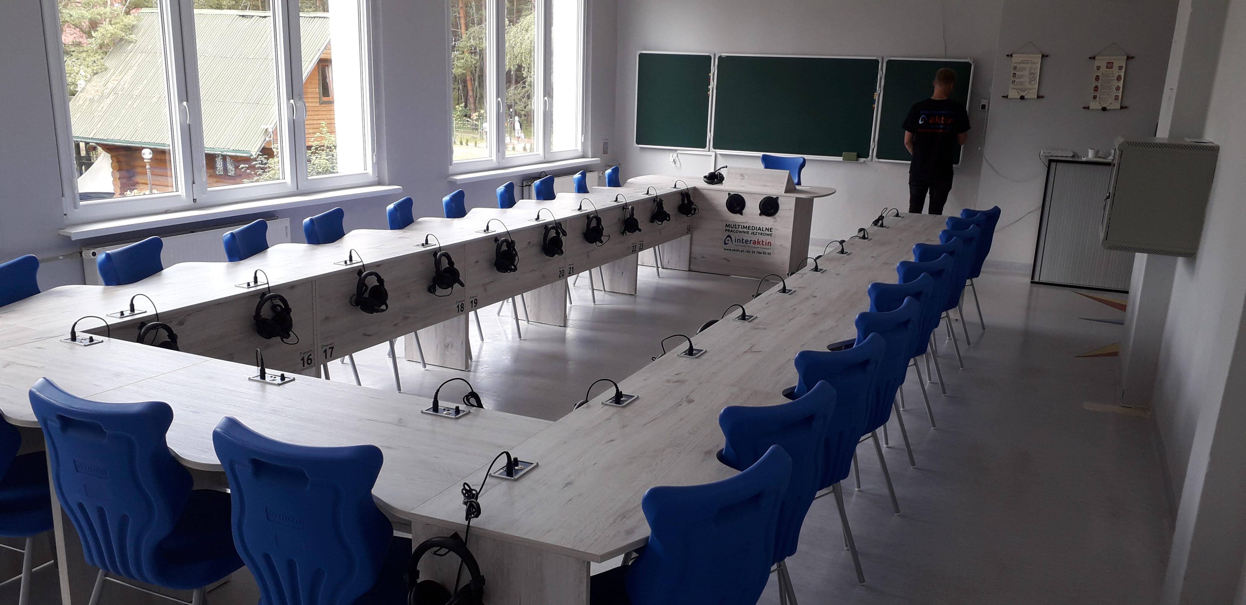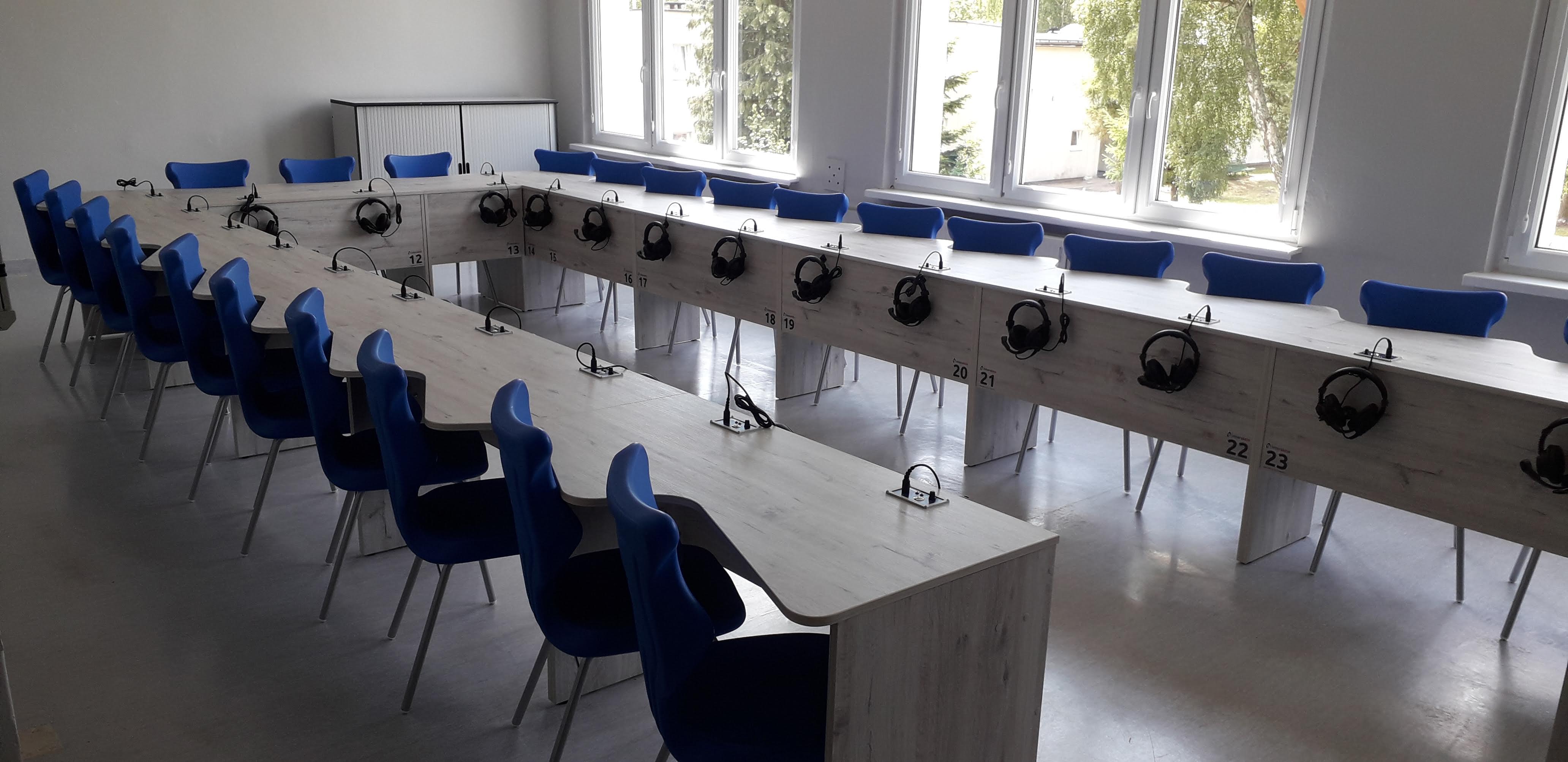 Pracownia językowa 24 stanowiska z pulpitami uczniowskim i wbudowanym monitorem dotykowym w blat nauczyciela.