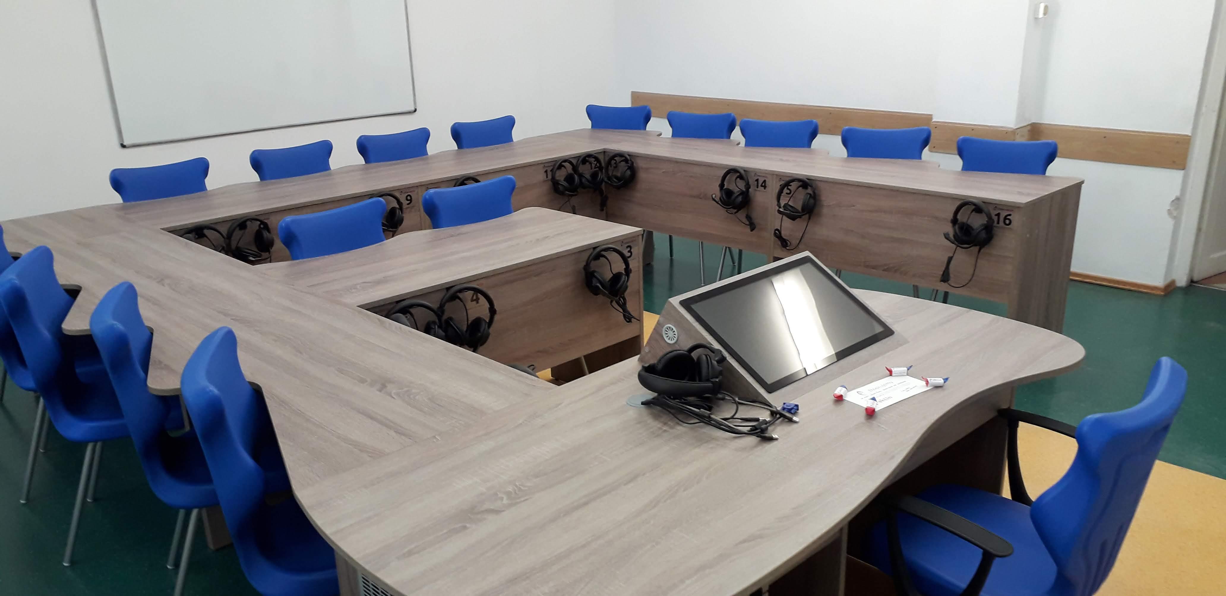 Pracownia językowa 16 stanowisk z wbudowanym monitorem dotykowym w blat nauczyciela.